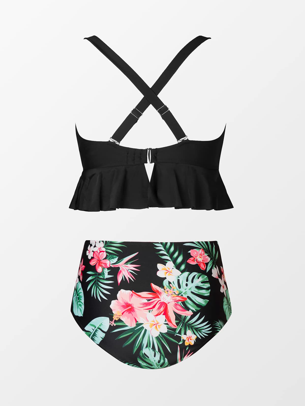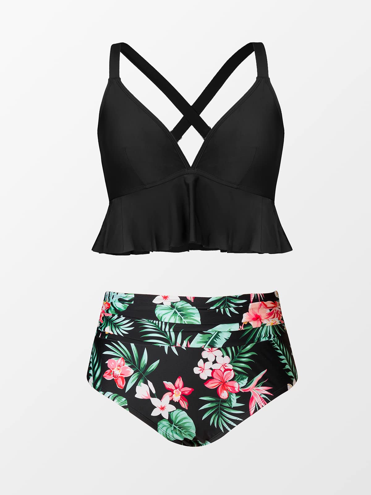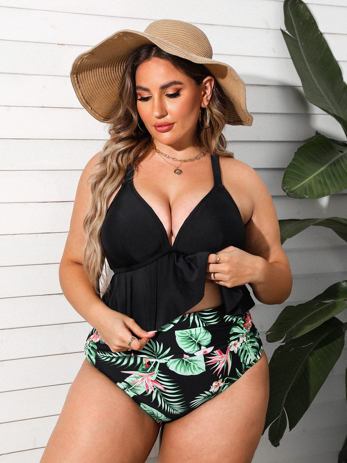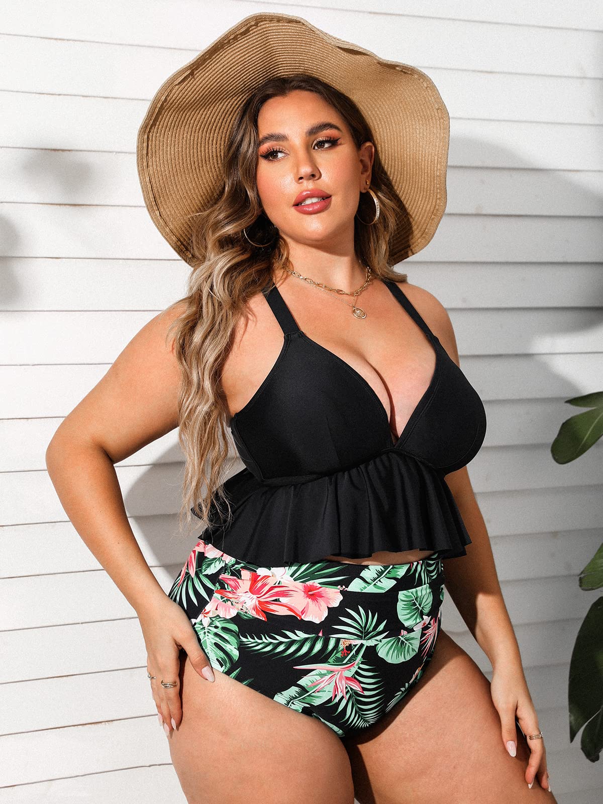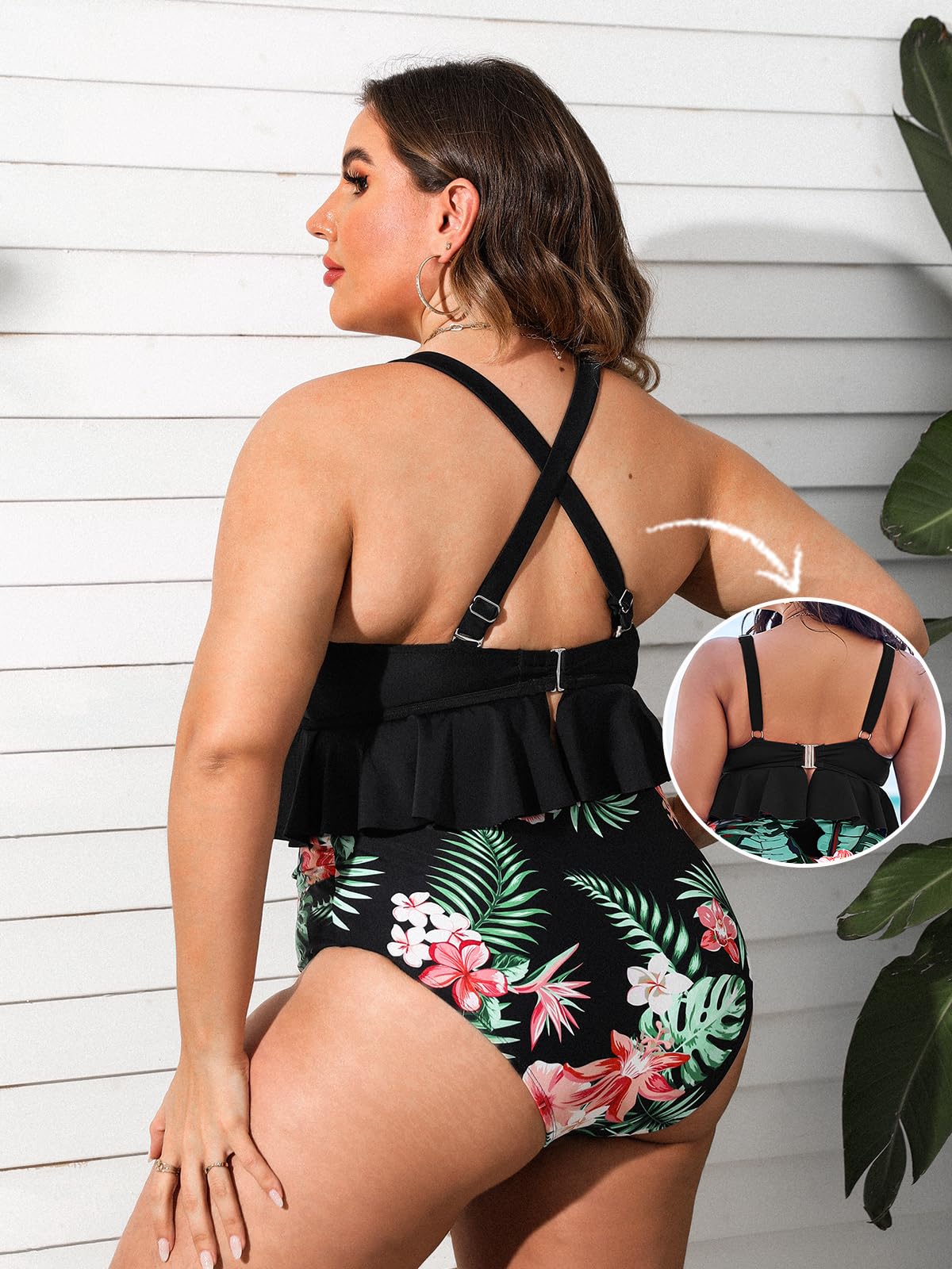 • Design: A Perfect Staple to Add to Your Summer Wardrobe, This V Neck Plus Size Bikini Set with Adjustable Wide Straps Features Flowy Ruffle Hem, While the Matching High Waisted Ruched Tropical Bottom Provides More Tummy Control. About Cup Style: with Removable Pads