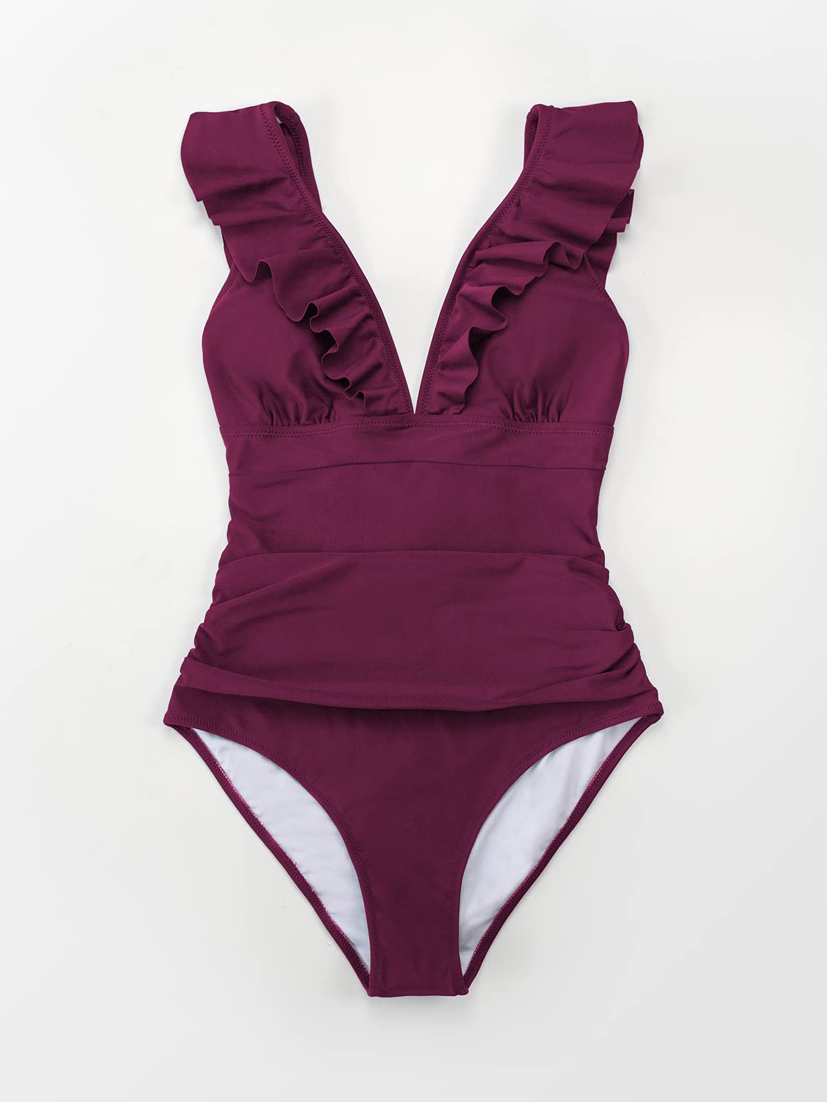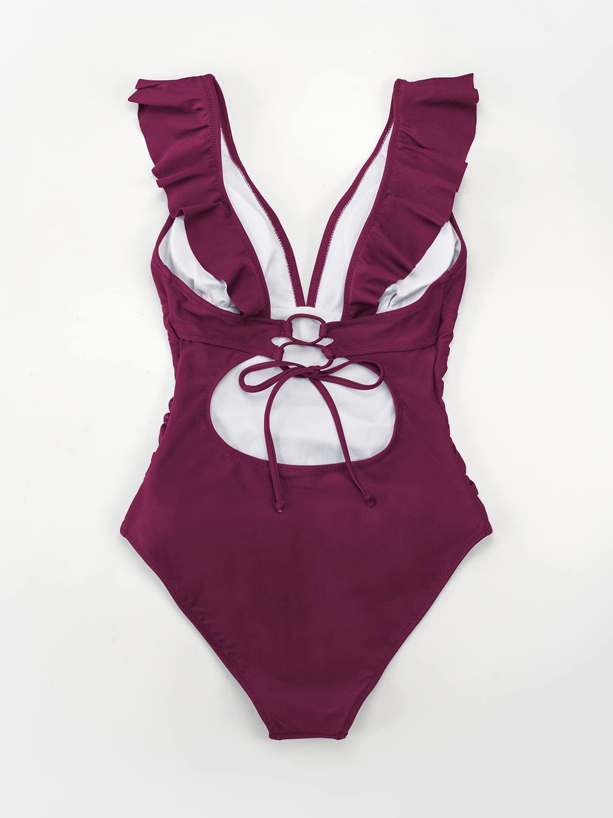 CUPSHE Women's One Piece Swimsuit Ruffle V Neck Lace Up Bathing Suit, M Burgundy