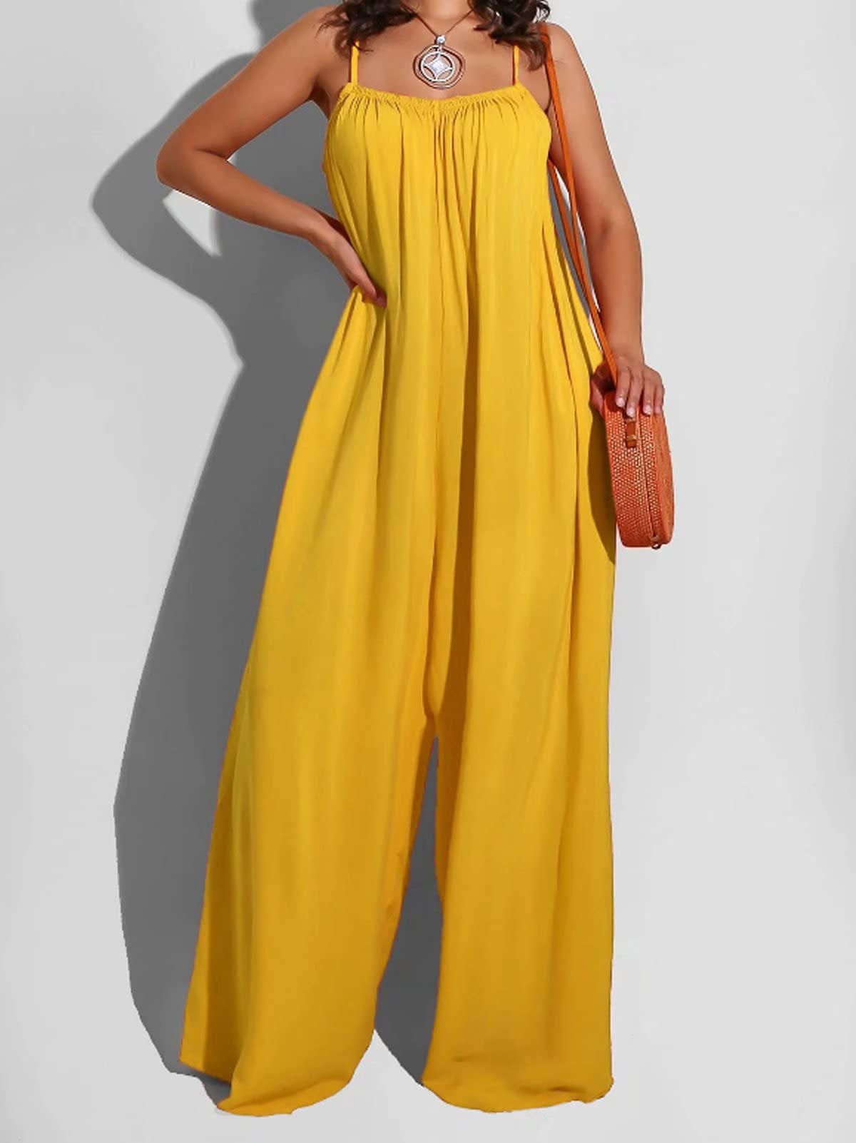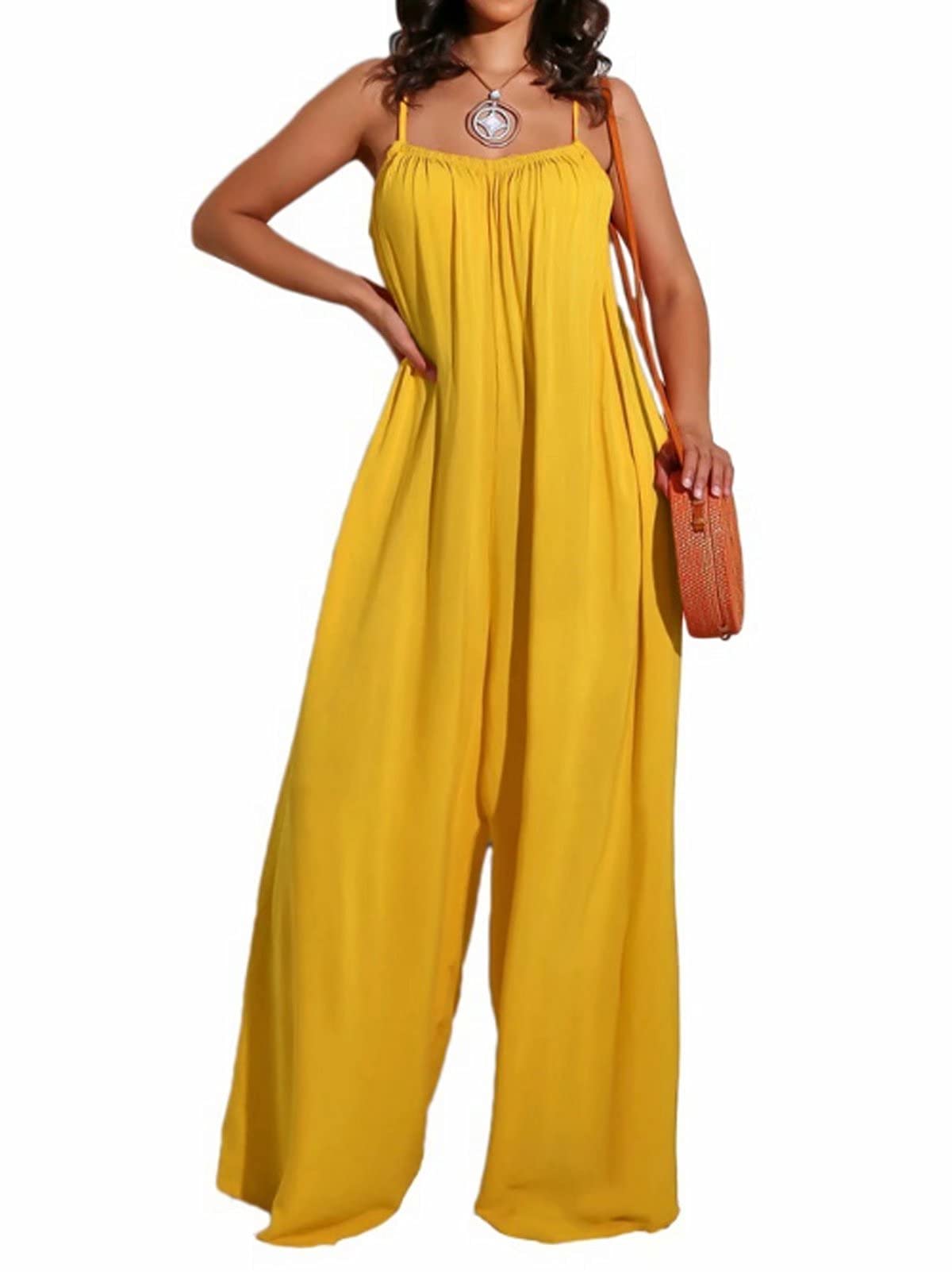 Ekaliy Women’s Sexy Spaghetti Strap Sleeveless High Waist Wide Leg Long Pants Jumpsuit One Piece Club Outfits Yellow Large