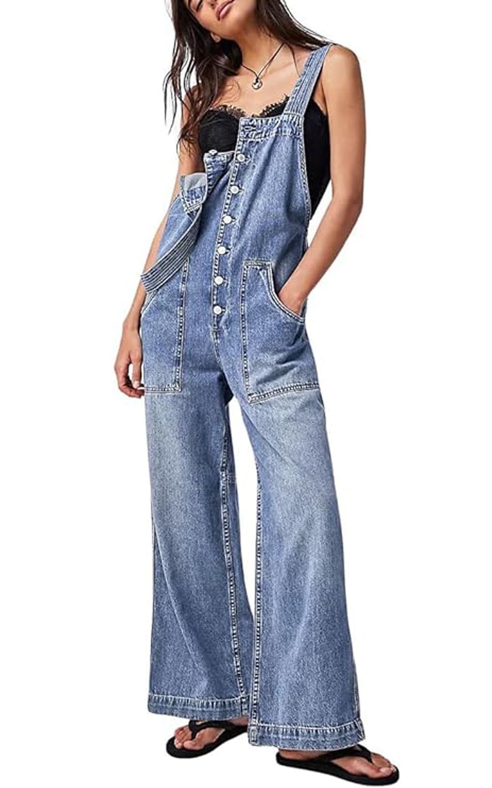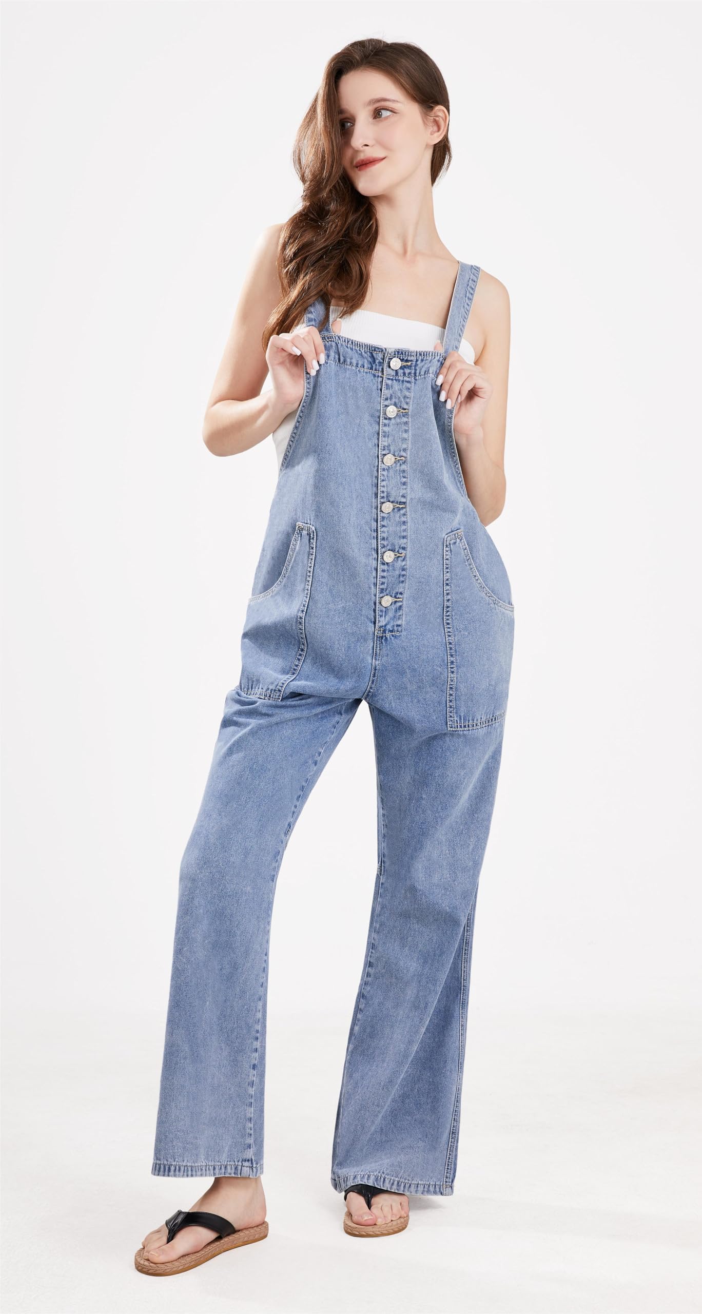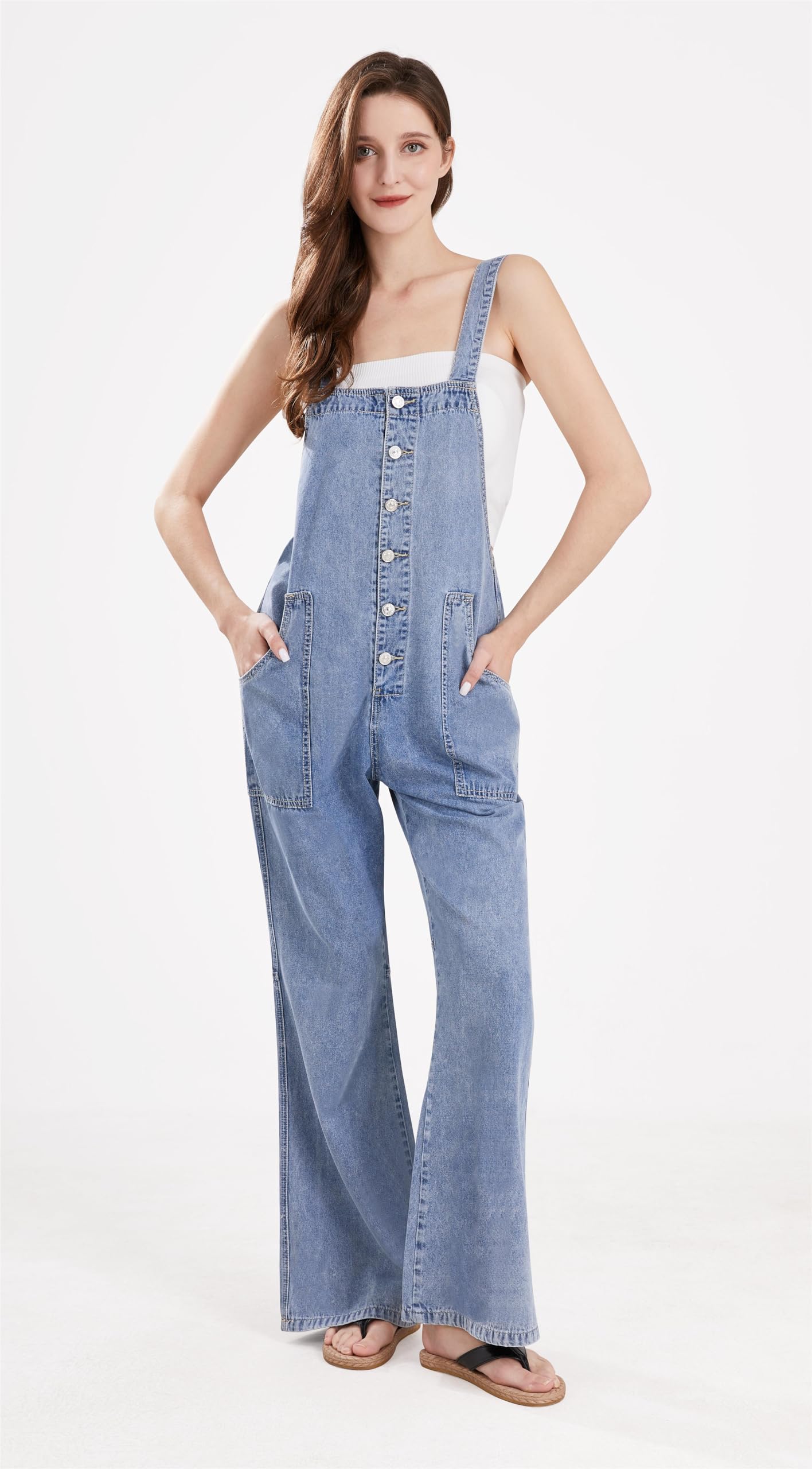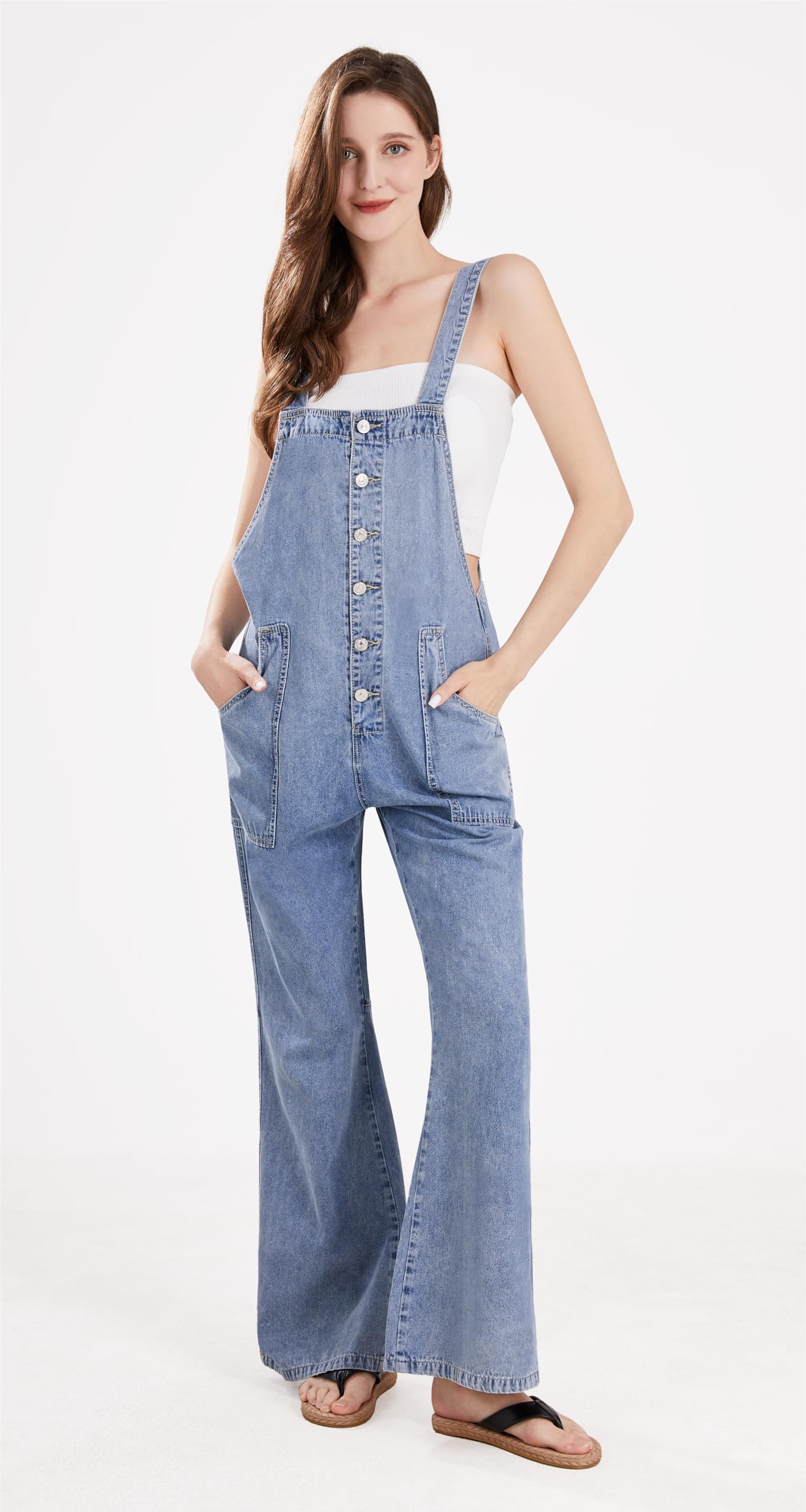 loveimgs Women's Casual Denim Jumpsuit Button Down Adjustable Strap Baggy Wide Leg Jeans Bib Overalls with Pockets (X-Large,Light blue)