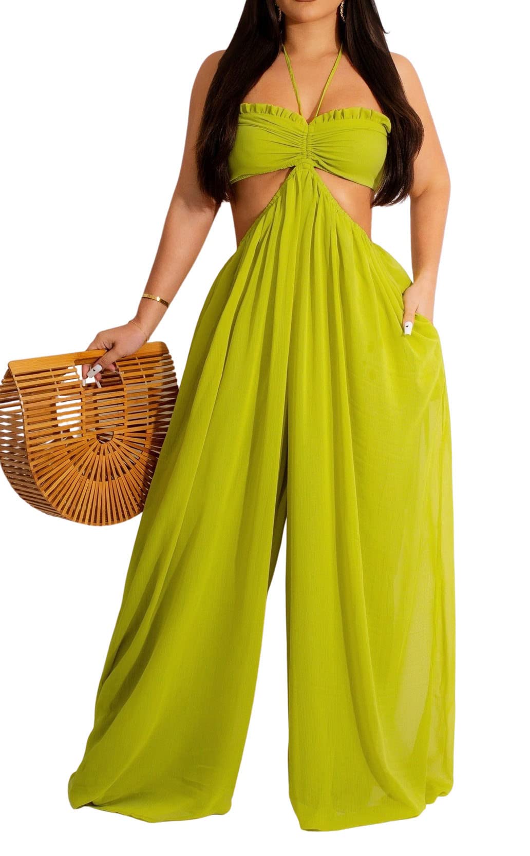 loveimgs Women's Chiffon Halter Neck Backless One Piece Jumpsuit Cut Out Bandage Wide Leg Pants Rompers (X-Large, Green)