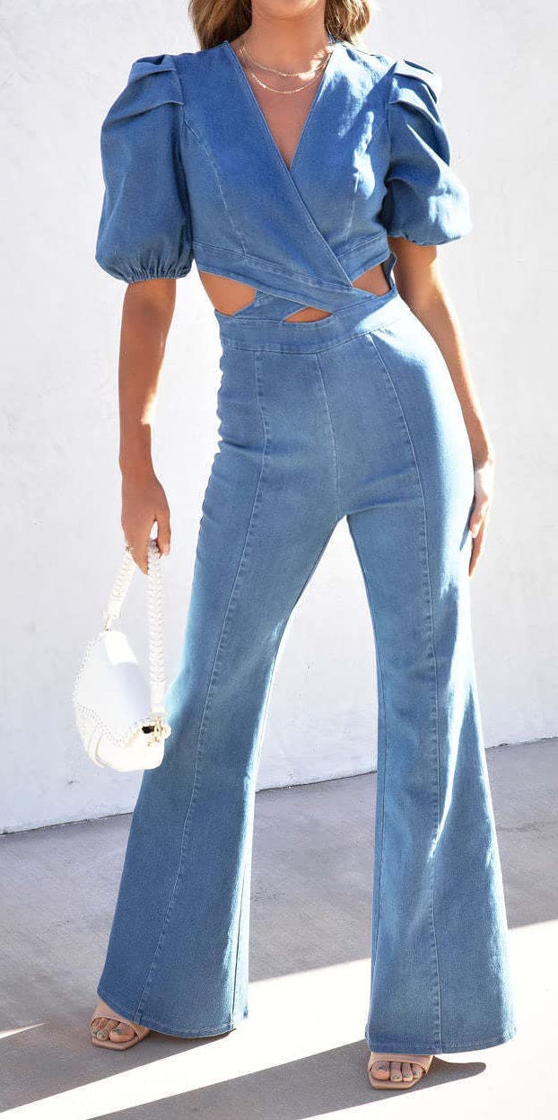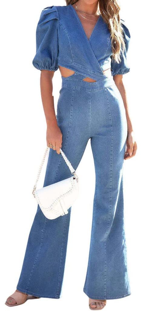 loveimgs Women's V Neck Puff Sleeve Denim Jumpsuit Zipper Cutout Bell Bottom Pants Jean Rompers (X-Small, Blue)