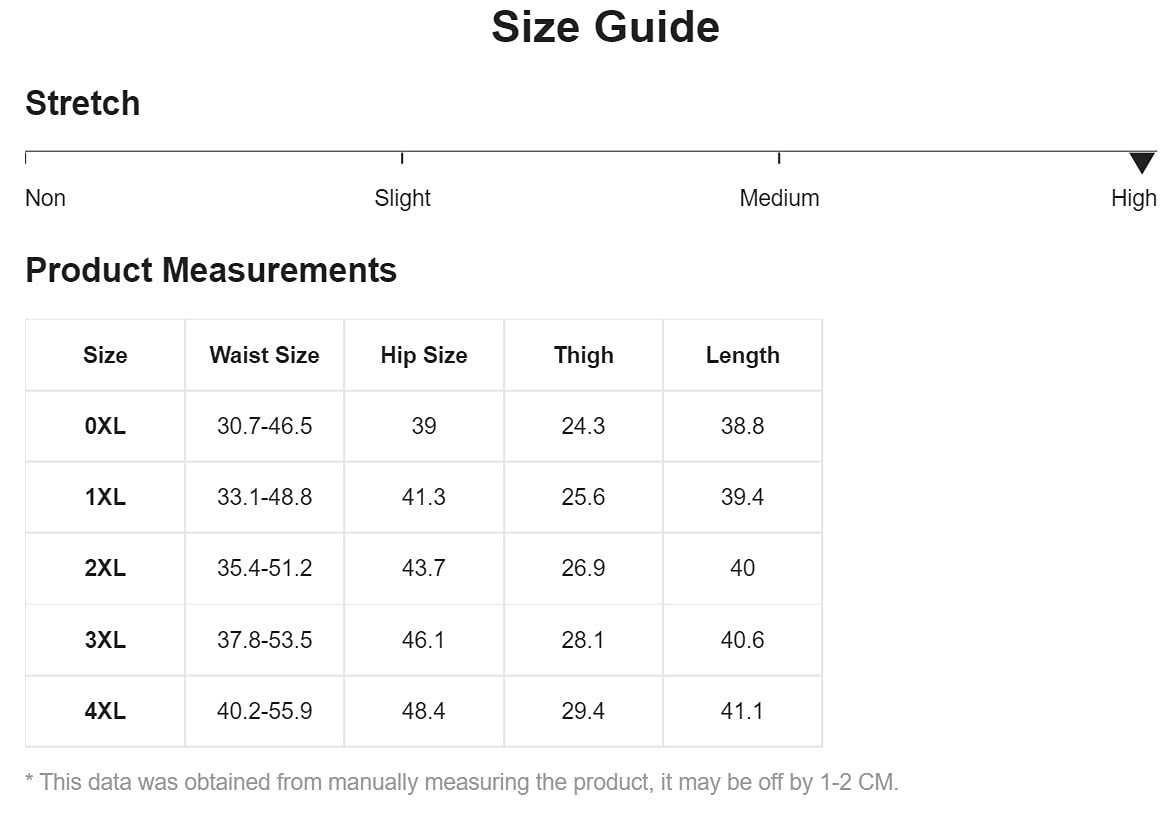 Details: Size Chart: Large Plus—— Waist Size:30.7-46.5", Hip Size:39", Thigh:24.3", Length:38.8"/ X-Large Plus—— Waist Size:33.1-48.8", Hip Size:41.3", Thigh:25.6", Length:39.4"/ XX-Large Plus—— Waist Size:35.4-51.2", Hip Size:43.7", Thigh:26.9", Length:40"/ 3X-Large Plus—— Waist Size:37.8-53.5", Hip Size:46.1", Thigh:28.1", Length:40.6"/ 4X-Large Plus—— Waist Size:40.2-55.9", Hip Size:48.4", Thigh:29.4", Length:41.1"/