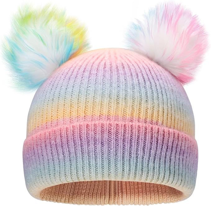 ACTLATI Kids Winter Knitted Beanie Hat Colorful Pompom Ears Ski Hat for Boy Girl(Ages 7-12)