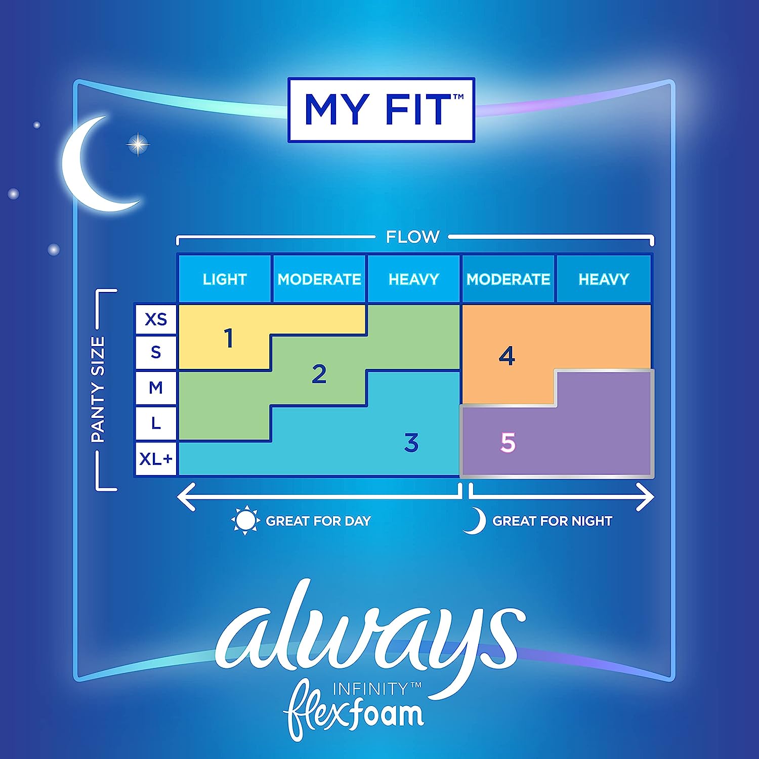 Always Infinity FlexFoam Extra Heavy Overnight Absorbency pads feel like nothing and protect like nothing else. FlexFoam pads are unbelievably thin and flexible so your pad moves with you, not against you. Zero Feel protection is possible with form fitting grooves that conform to your shape, and super absorbent holes that pull wetness away from your skin. Always' driest top layer is breathable, so you can say goodbye to hot and stuffy. With Always Infinity FlexFoam pads your period is the last thing on your mind.
