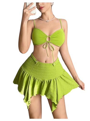 • Feature: Sexy and chic two piece outfit for women, ruched, drawstring, tie front, cut out, cami crop top, asymmetric hem, lettuce trim, ruffle hem, low waist, mini skirt, making you look pretty and charming.