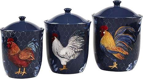 Certified International Indigo Rooster 3 pc Canister Set, 52 oz, 74 oz. 96 oz, Multicolor