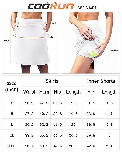 Details: COOrun Women's Athletic Tennis Skirt knee Length Golf Skorts High Waisted Casual Skirts with Pockets ●Material: Stretchy quick-dry SPF skirts with moisture-wicking breathable mesh inner shorts,skin-friendly and soft provide all-day comfort for you and protect you from UV rays.  ●Convenience Design : Knee-length Tennis Skirts have 3 pockets,2 deep side pockets in skirts convenient for storing your essentials, 1 hidden downward opening pocket in inner shorts that can carry your balls during playing tennis. Slit in the side of the skirt facilitate your movement.  ●Occasions: Knee-Length Skorts great length just above the knee provide enough coverage. Perfect choice for tennis, badminton, table tennis, dance, Gym exercise, cheerleader, golf.  Package: 1 x Athletic Skirt  100% Brand New Material:90%polyester10%spandex 4 Colors available: Black, White, Navy Blue,Grey Blue