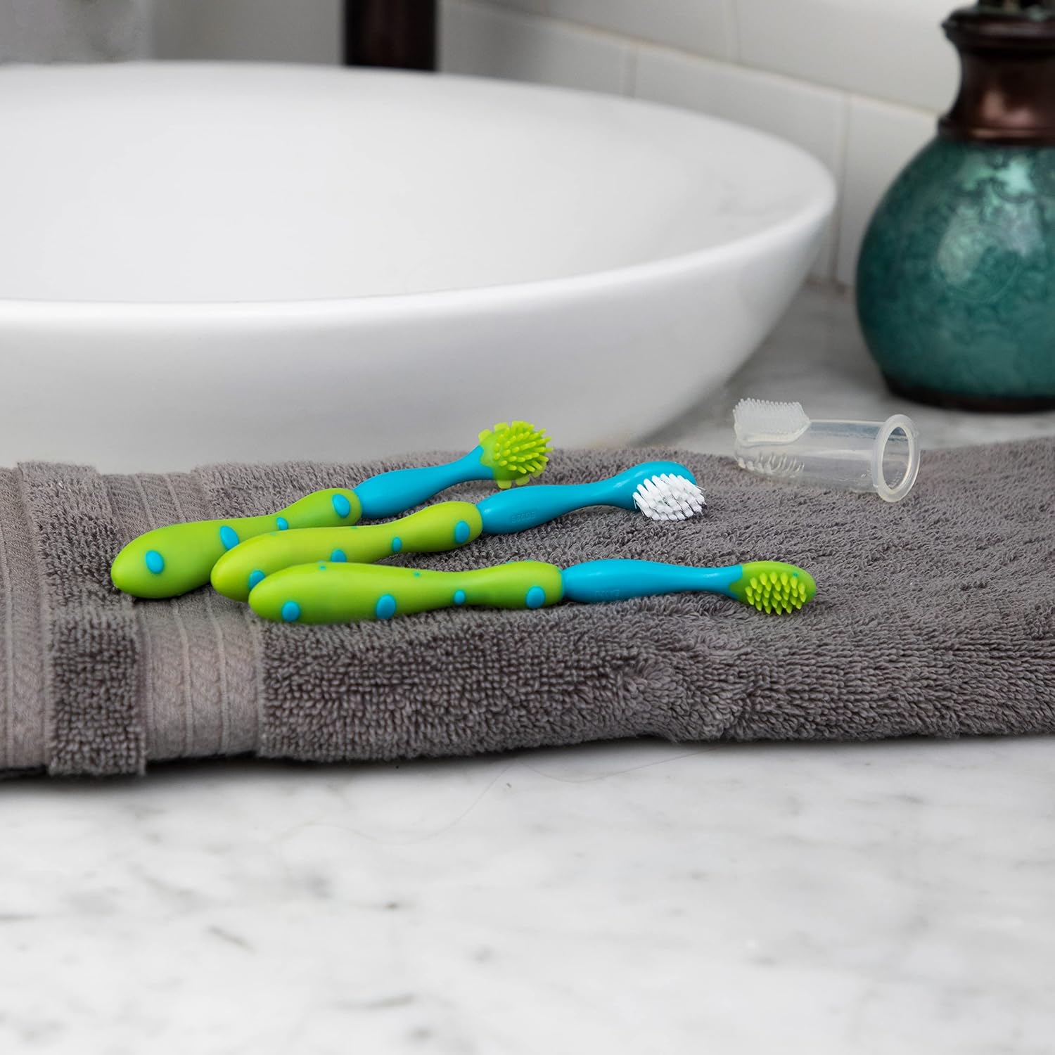 Dr. Talbot's Oral Care Set with Stand; 4-Stage System with 1 Silicone Finger Massager, 2 Massaging Brushes, 1 Soft Nylon Bristle Toddler Toothbrush; 0+ Months, Blue & Aqua