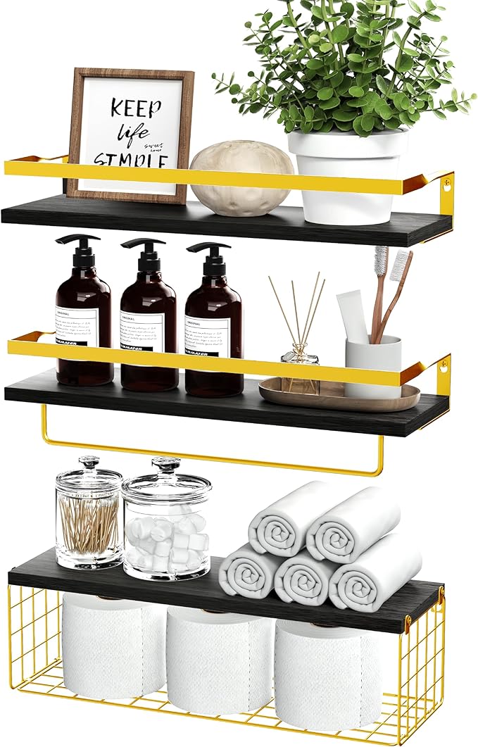 Floating Shelves for Wall Decor Bathroom Shelves Over Toilet with Paper Storage Basket, Farmhouse Wall Shelves for Bathroom, Bedroom, Living Room, Kitchen(Black and Gold, Set of 3)