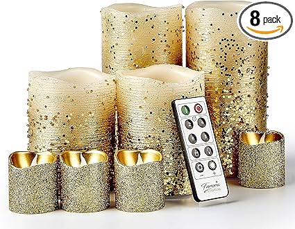 FURORA LIGHTING Gold Glitter Real Wax Candles with Remote and Timer, 4 Pillars and 4 Votives Pack of 8, LED Flameless Flickering Candles for Home D�©cor, Battery Included