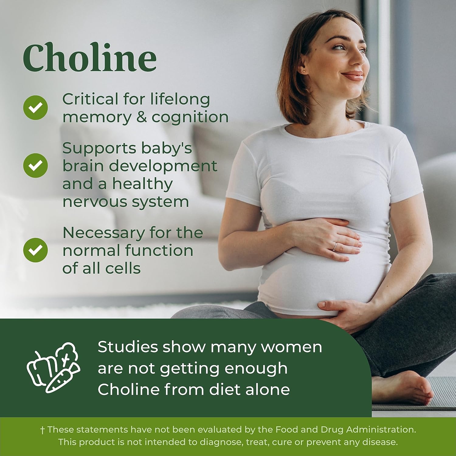 • Choline is critical for lifelong memory and cognition, supports baby's brain development and a healthy nervous system, and is necessary for the normal function of all cells