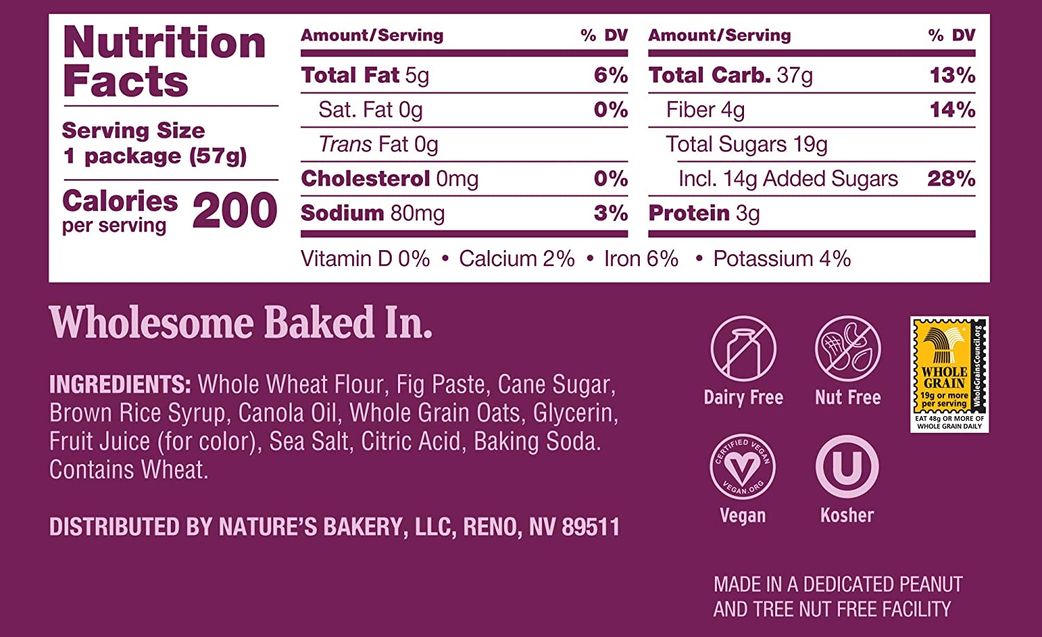 • NUTRITION Made with you and your family in mind, Nature's Bakery Whole Wheat Fig Bars are soft-baked with NO cholesterol, GMOs or high fructose corn syrup. No Artificial Flavors, Certified Vegan, Plant Based, Kosher, Made in a Nut-Free Facility, Low Sodium, Soy Free, Dairy Free, and 0g Trans Fat