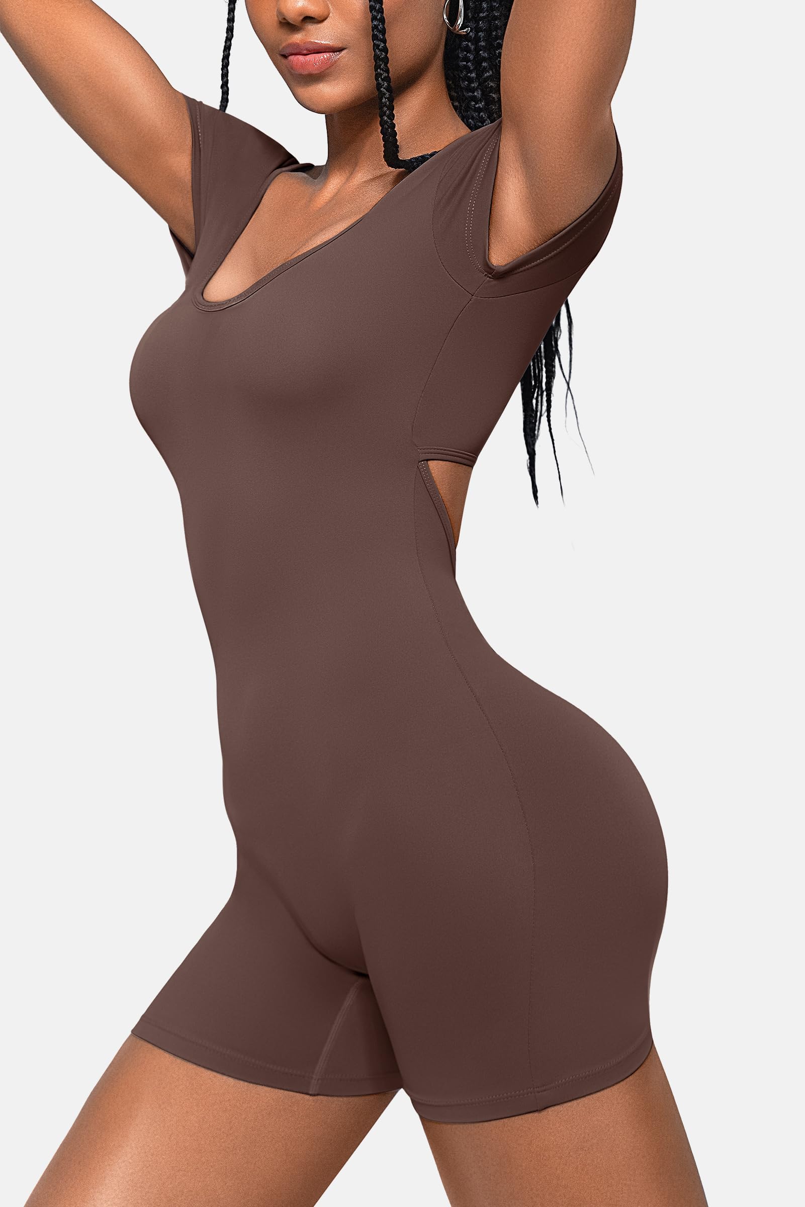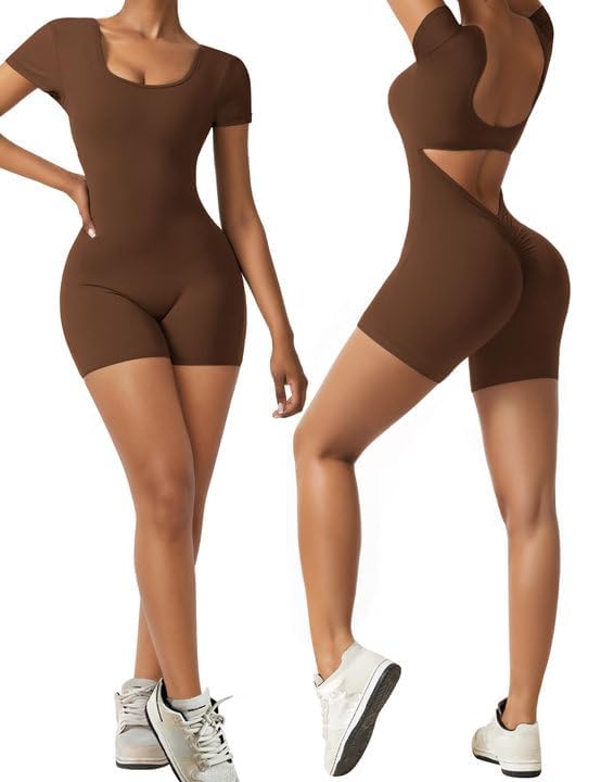 OEAK Short Sleeve Jumpsuit Workout for Women Square Neck One Piece Backless Tummy Control Bodycon Scrunch Butt Yoga Rompers(Coffee,XL)