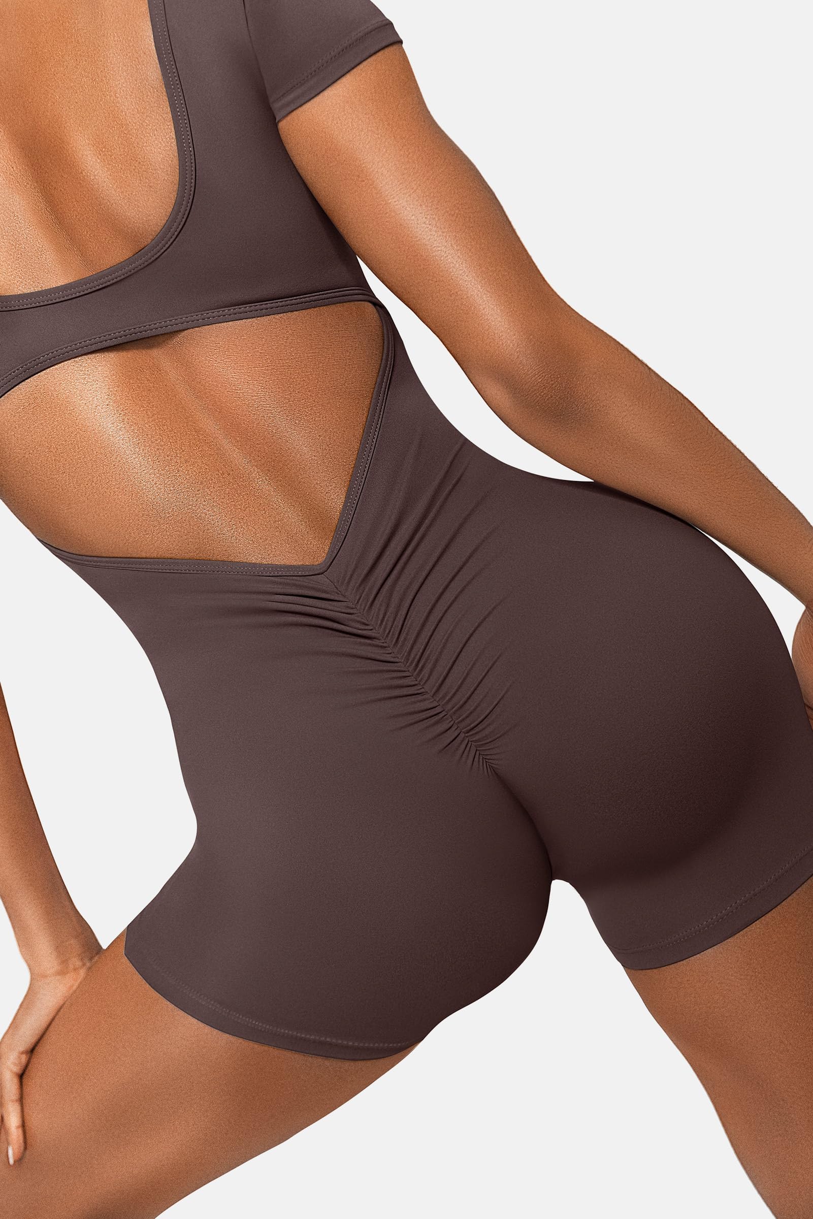 • 【Scrunch Butt Design】The V-back scrunch butt shorts jumpsuit enhances your natural booty shape, resembling a juicy peach. It features a gusseted crotch for greater freedom of movement and flexibility, making it a squat-proof athletic jumpsuit.