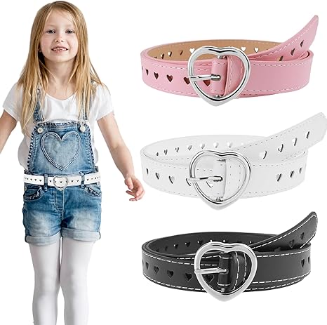 Pack of 3 Girls Belt Kids' PU Leather Belts, Adjustable Hollow Heart Shape with Silver Buckle, Versatile for Dresses, Pants, Jeans (Pink, White, Black)