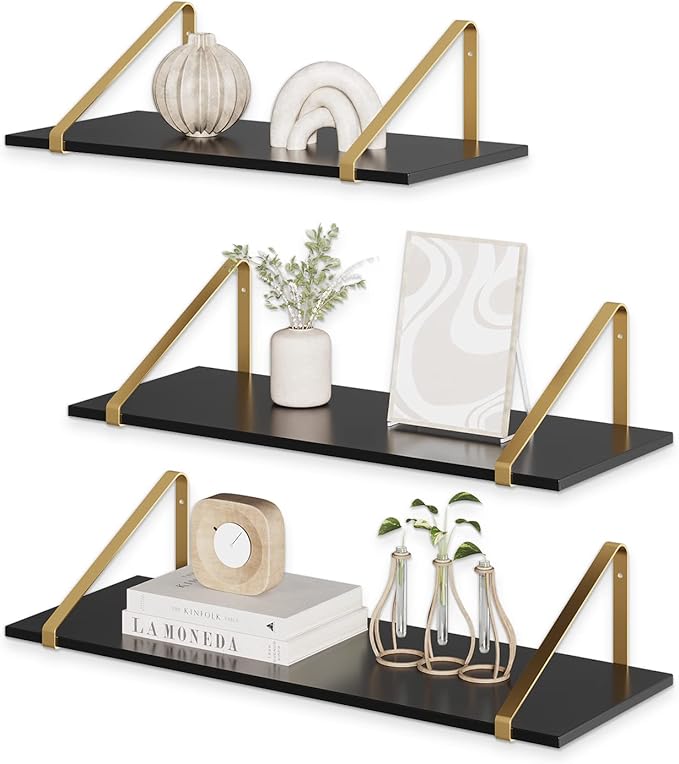 RRG Acrylic Floating Shelves for Wall Decor Set of 3, Gold Wall Shelf with Metal Brackets, Wall Storage Shelves for Bedroom, Living Room, Bathroom, Kitchen (Black, 16in/14in/12 in)