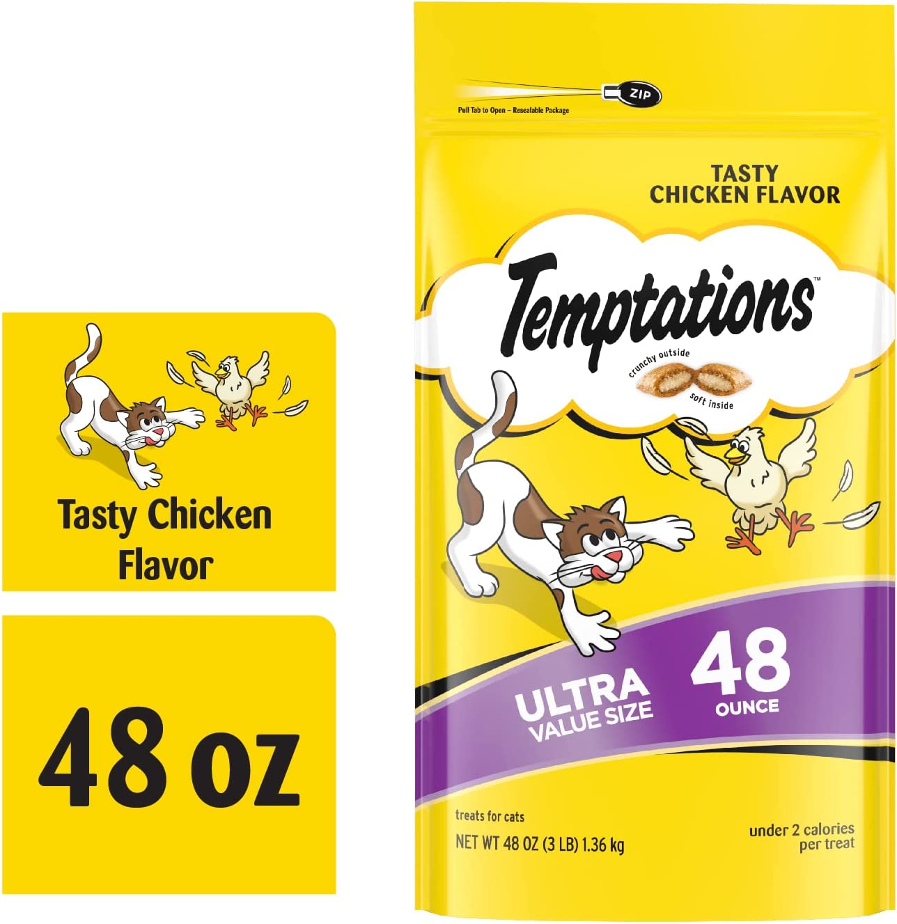 Cats can’t resist the delectable taste of Temptations, so give your cat these perfect Temptations Classic Cat Treats they’ll come running the moment you open the tub. Each of these low calorie chicken flavor cat snacks has less than 2 calories and provides an irresistible combination of both crunchy and soft textures. These healthy cat treats also come in a cat-proof, stay-fresh tub, so your feline friend can enjoy their favorite snack when you open it, but never when they shouldn’t. These Temptations Classic Cat Treats are a perfect addition to your cat’s normal feeding routine: Use them as a treat, a meal, or a cat food topper. They also are the perfect size treats for cat toys try mixing up playtime by placing a few inside a treat dispensing toy and watch your cat chase and swat away. Based on 2020 Nielsen sales data.