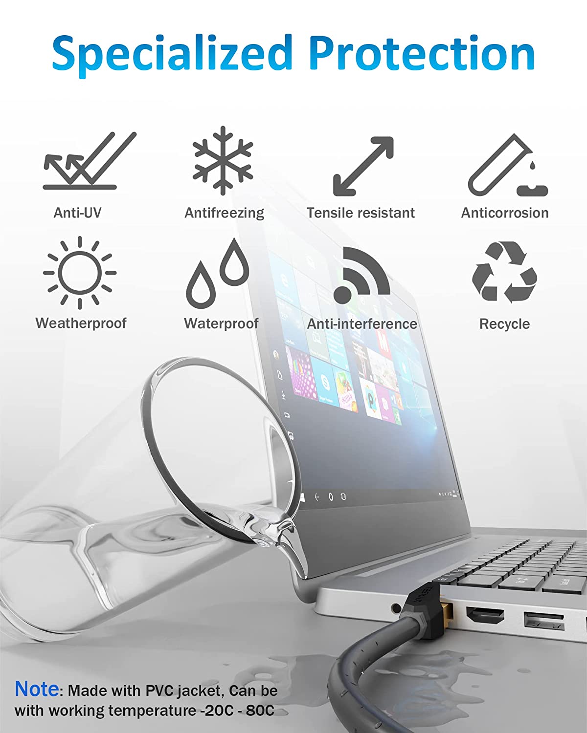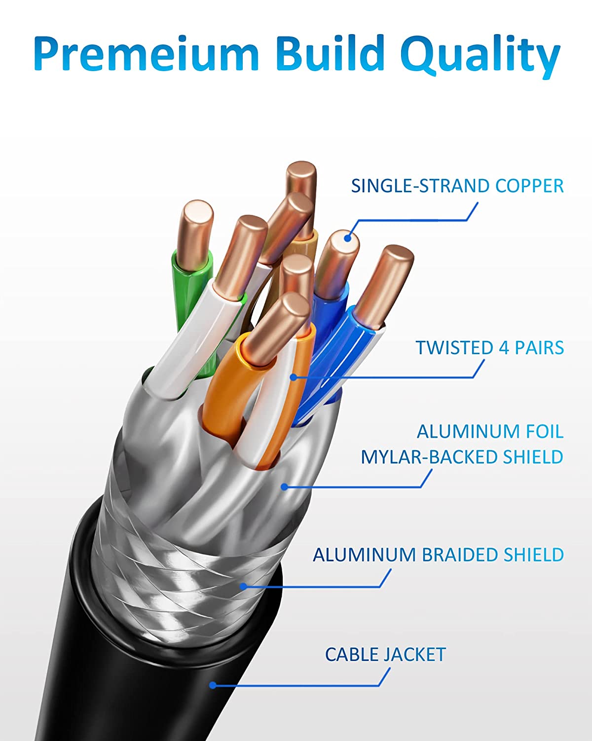 • 【Weatherproof & UV Resistant】Cat8 Lan cable is made with a pure copper core, aluminum foil shield, woven mesh shield, PVC outer cover and two gold-plate RJ45 connectors. With a high-quality structure, it is more durable & flexible for heavy duty work. Suitable for both outdoor and indoor use because of good water-resistance & anti-corrosion functionality. It can withstand direct sunlight as well as cold, humid & hot weather while maintaining performance and integrity