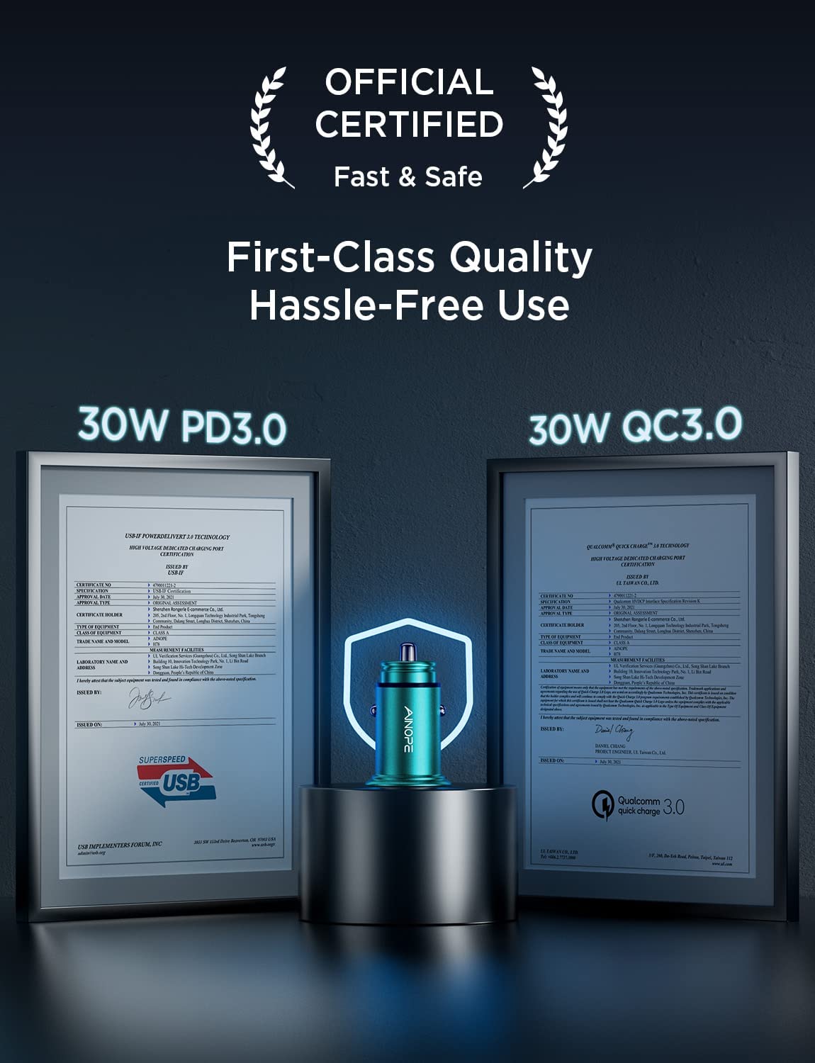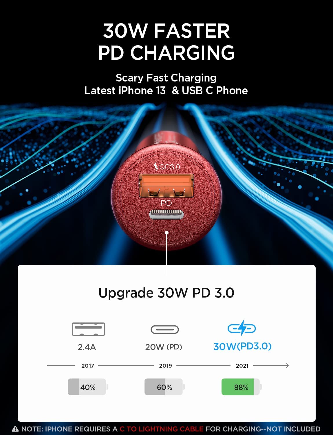 • ⚡OFFICIALLY APPROVED PD3.0 + QC3.0, AIM FOR FASTER & SAFER: This car charger has been recognized by official USB-IF and Qualcomm and passes 15 multi-layer tests, so charging efficiency has increased by 80% and charging stability rate increased by 93% and the using durability increased by 200% so you can charge faster and safer. Promise you, offering whole Life Charging.