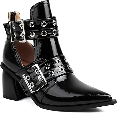 Women's Cutout Double Buckle Strap Booties Pointed Toe Chunky Block Heel Sandals with Back Zipper Summer Ankle Boots Dressy Heeled Sandal