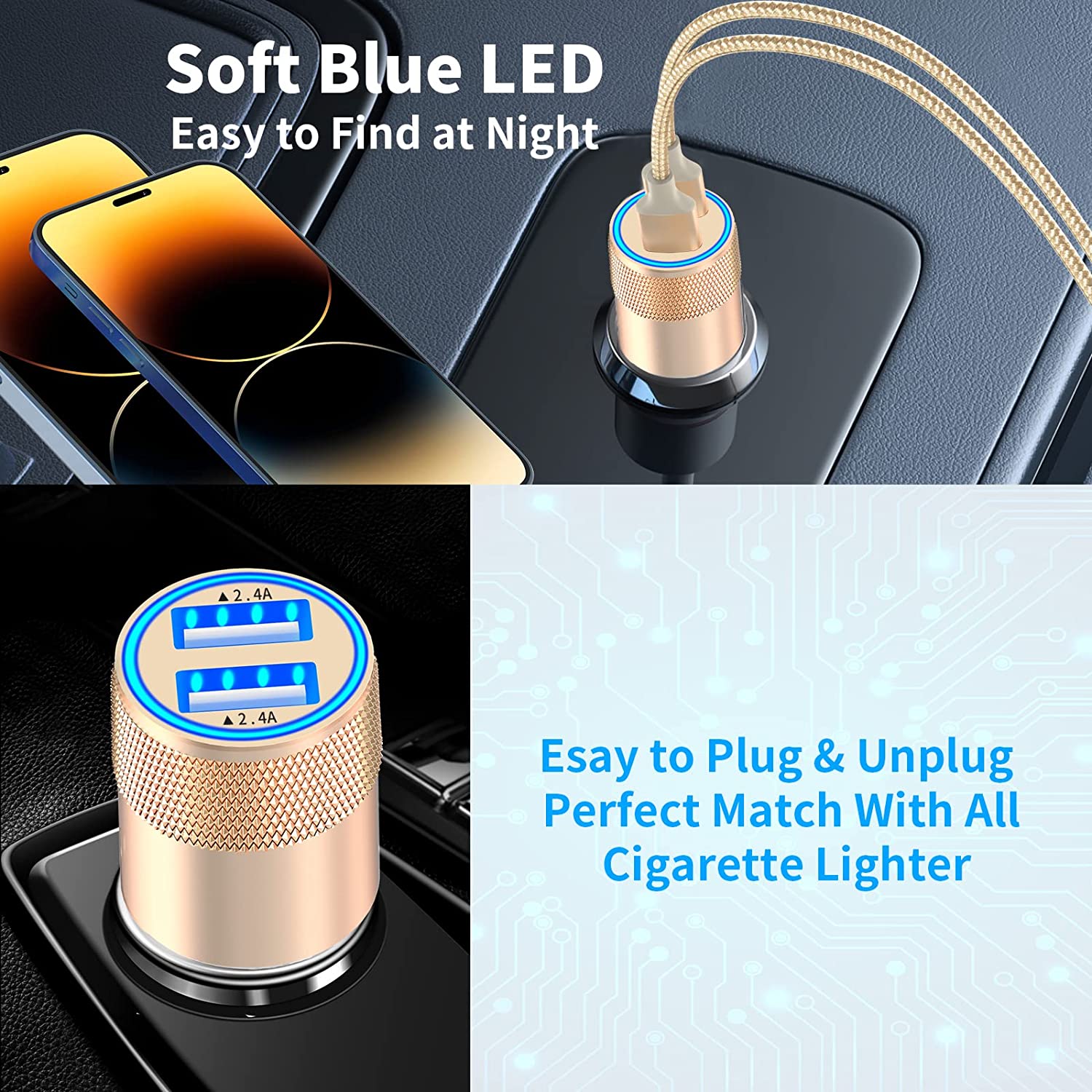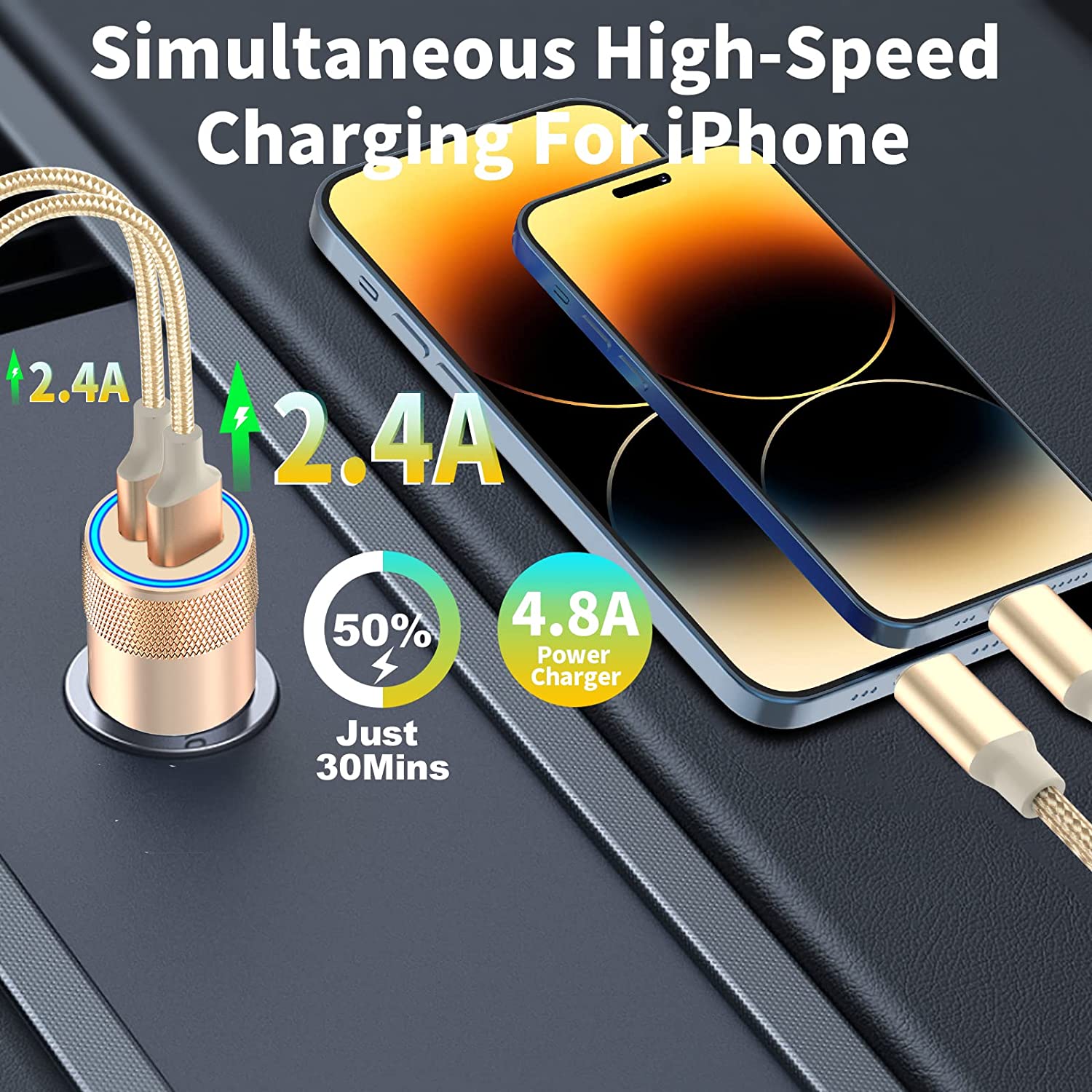 1. Charging two devices simultaneously with this incredibly powerful 24W dual USB car fast charger to match your iPhone device's need.