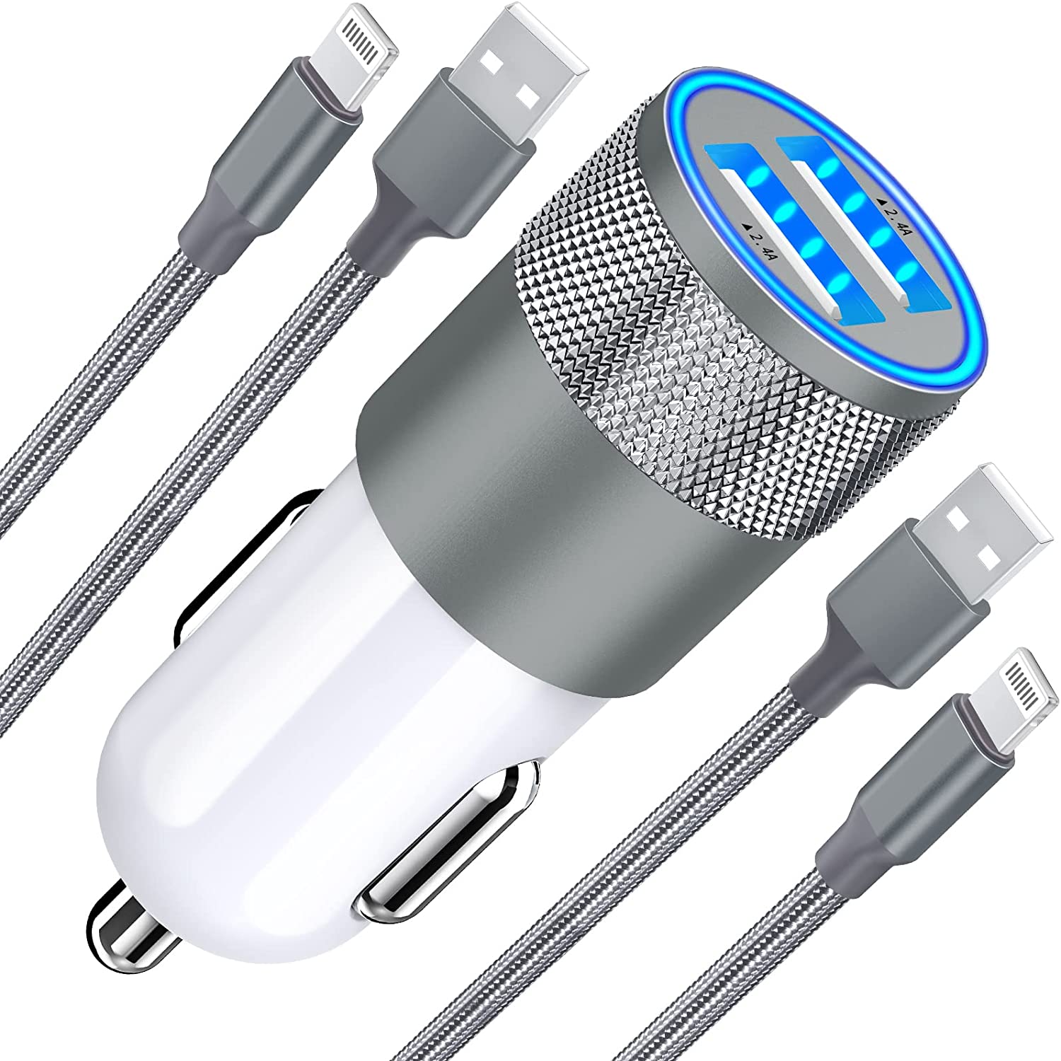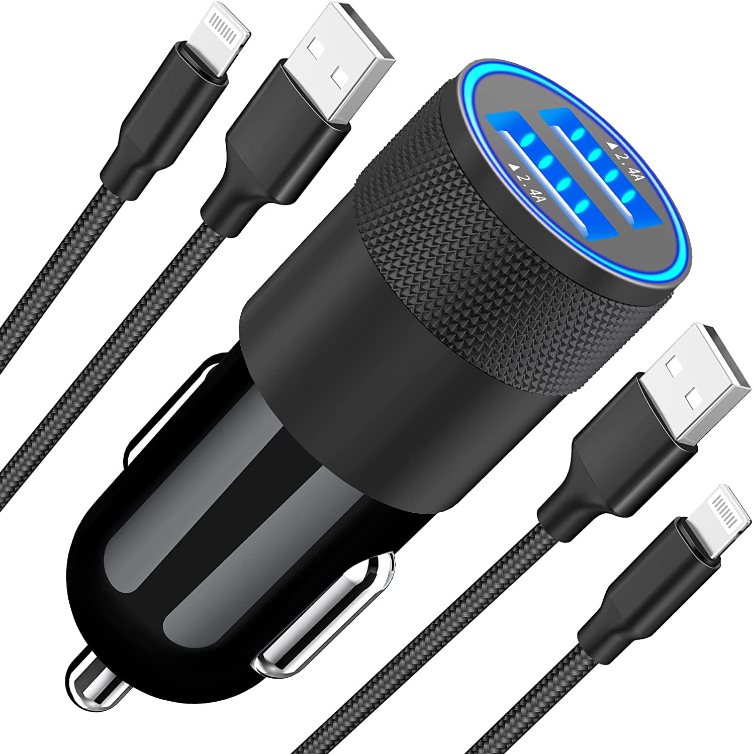 1. 24W Dual USB Port Fast Car Charger + 2 * 3FT MFi Certified Lightning Braided Cable.