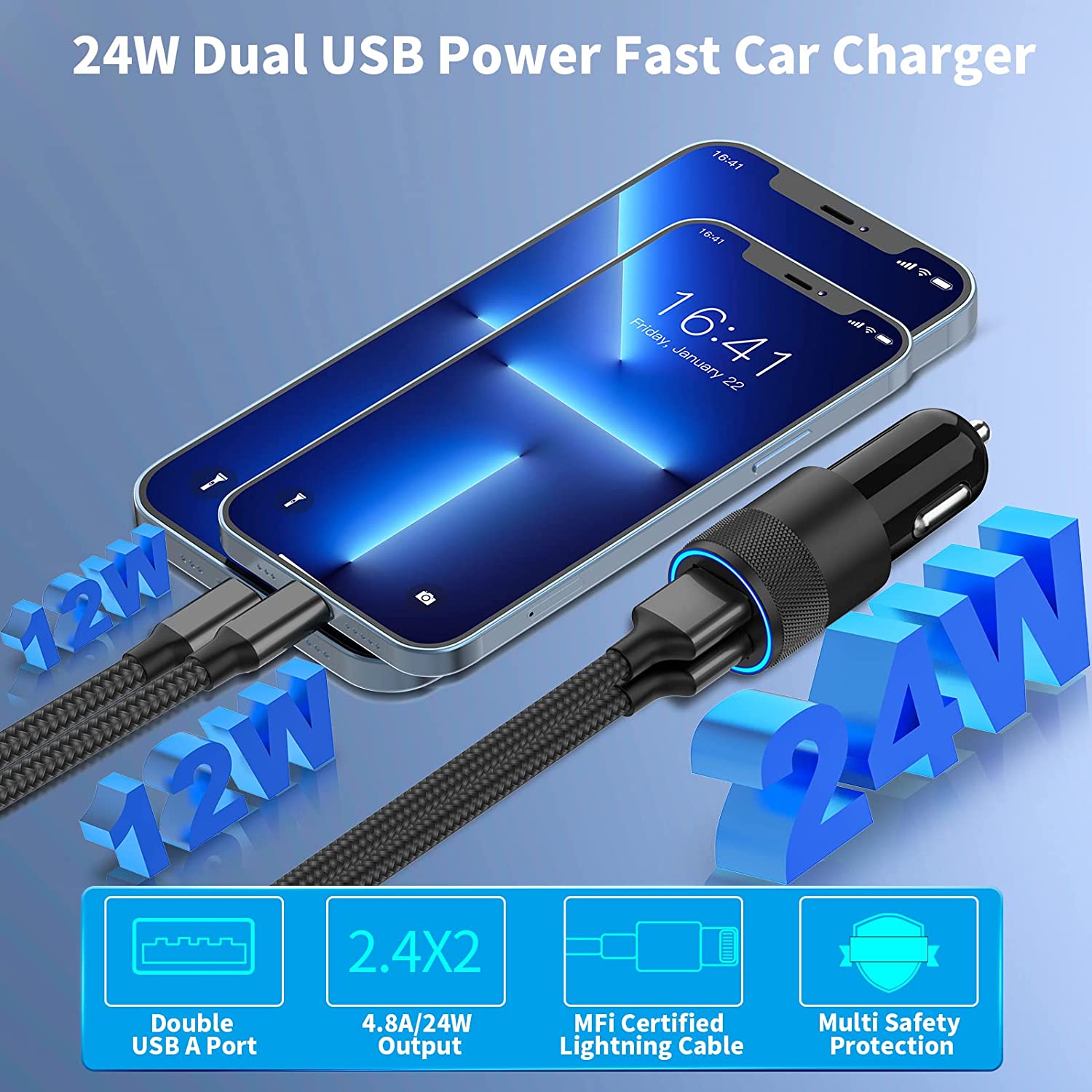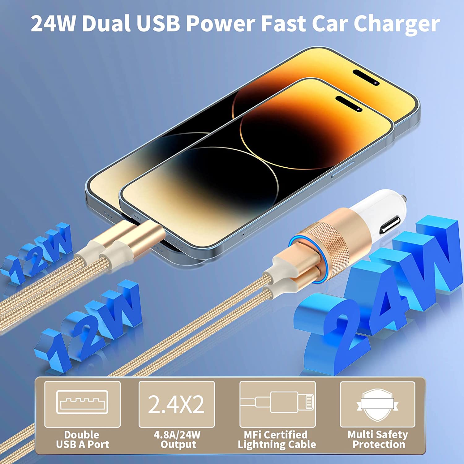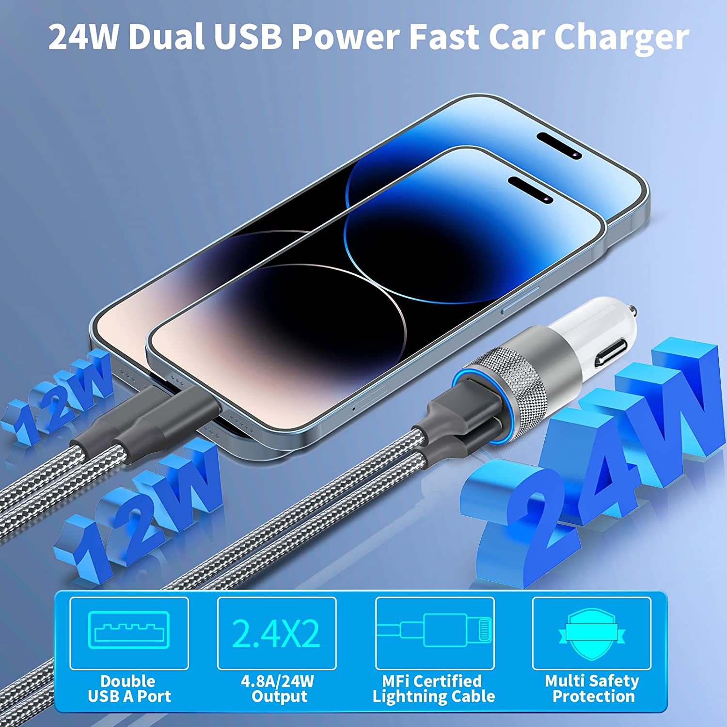 MFi Certified 4.8A/24W Dual USB Power Port Fast Car Charger for iPhone/iPad/Airpods
