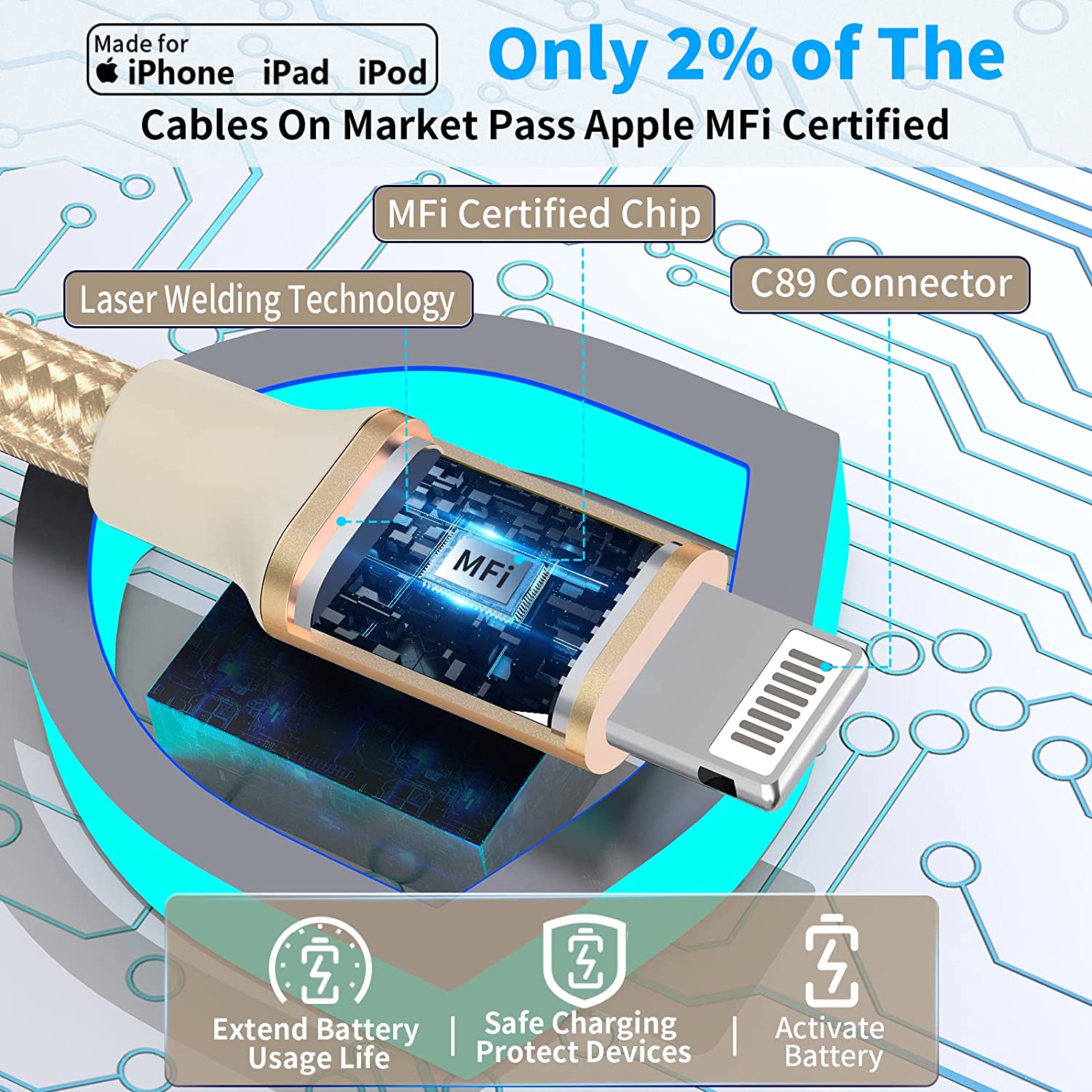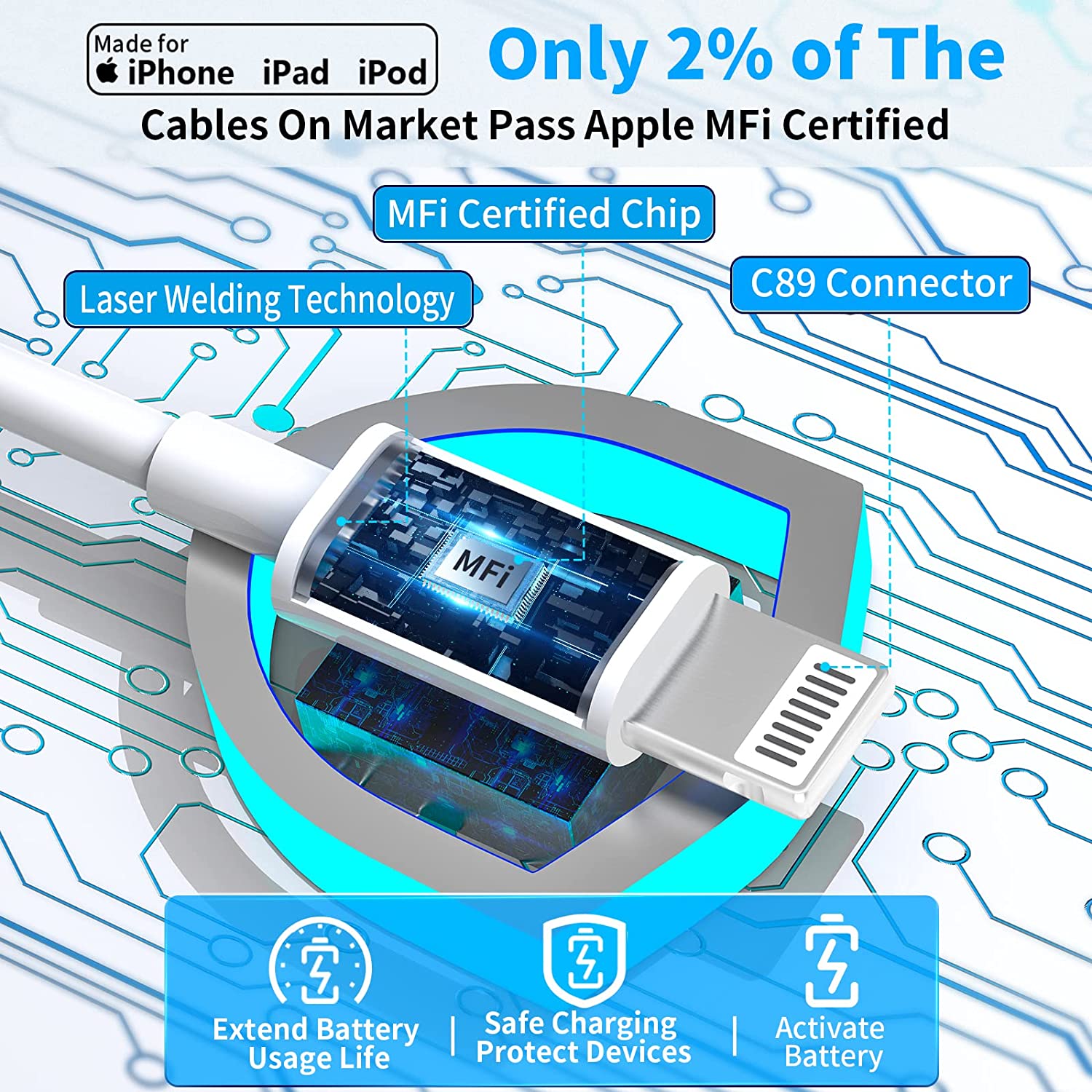 1. USB to Lightning cable with C89 Chip, Built with Latest C89 Terminal and Smart Chip to Ensure a completely compatibility with iOS system.