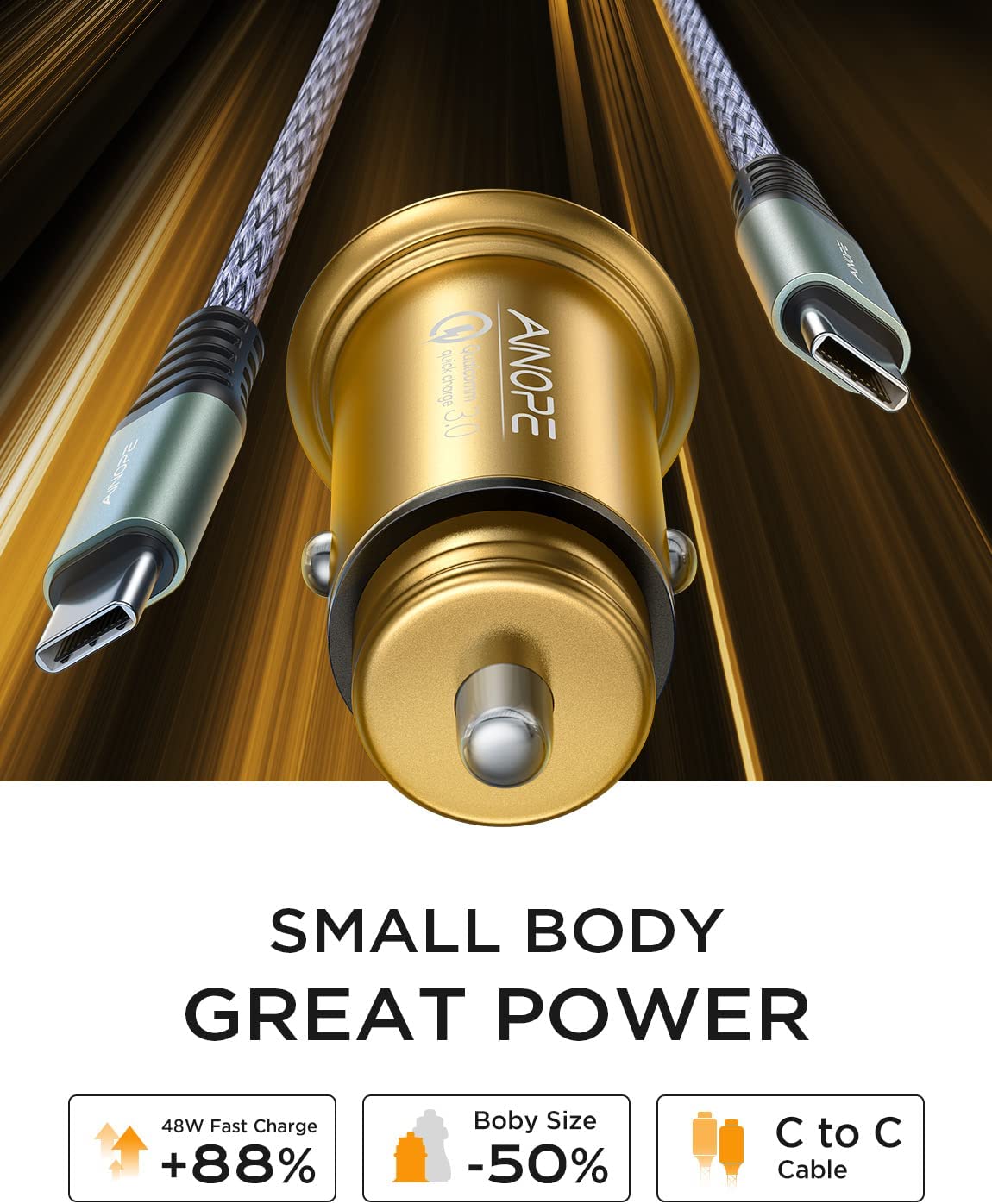 • ⚡COMPACT SIZE & ALL METAL, SMALLER AND SAFER: 1. Tiny thumb-sized body of type C car charger perfectly fits and sits snugly with most cigarette lighters, freeing up more space and providing you comfortable aesthetic. 2. The solid full Aluminum Alloy body features exquisite texture and durable lifetime, and protects your devices from over heating, over-voltage, over-current.