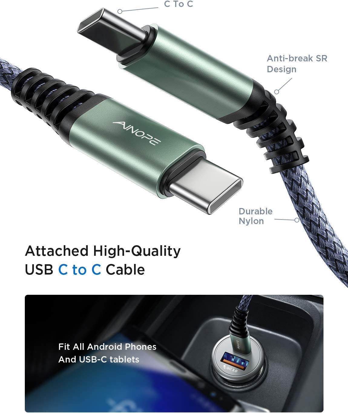 • ⚡DURABLE USB C-C CABLE, COST EFFECTIVE AND CONVENIENT: Aiming to offer more convient driving experience, AINOPE Attached a 3.3 ft nylon USB C to C cable featured Anti-break SR and hard-wearing nylon, enduring more than 40,000+ times bending test without break. What's more, it support fast charging up to 30W, perfect compatible with all android & USB C device. (NOTE: Only work with USB-C connector. It does not work with Lightning connector.)