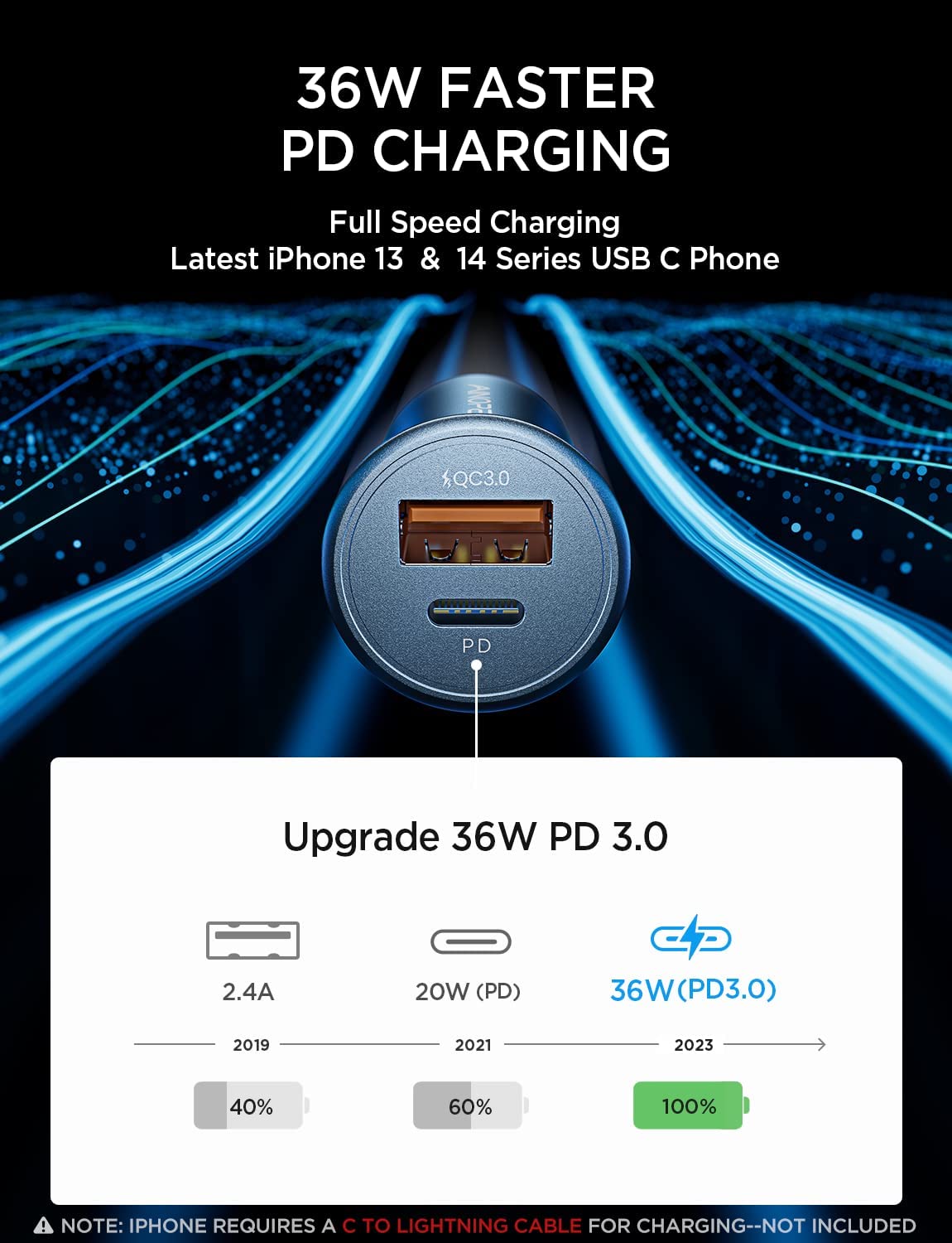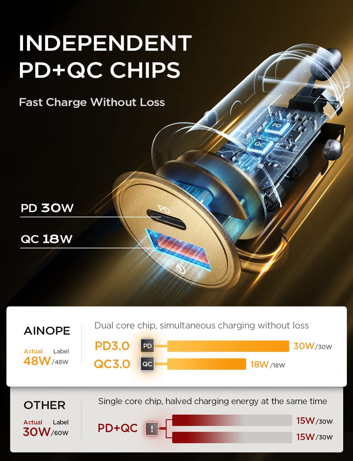 • ⚡FAST CHARGER TWO DEVICES SIMULTANEOUSLY: Equipped with USB A(QC3.0) port and USB C(PD3.0) port, AINOPE cigarette lighter usb charger can charge two devices simultaneously, no drop in power even when simultaneously fast charging as its indepent PD&QC3.0 protocol chip. (❤️TIPS: IPHONE REQUIRES A LIGHTNING TO C CABLE FOR CHARGING(NOT INCLUDED!!!).