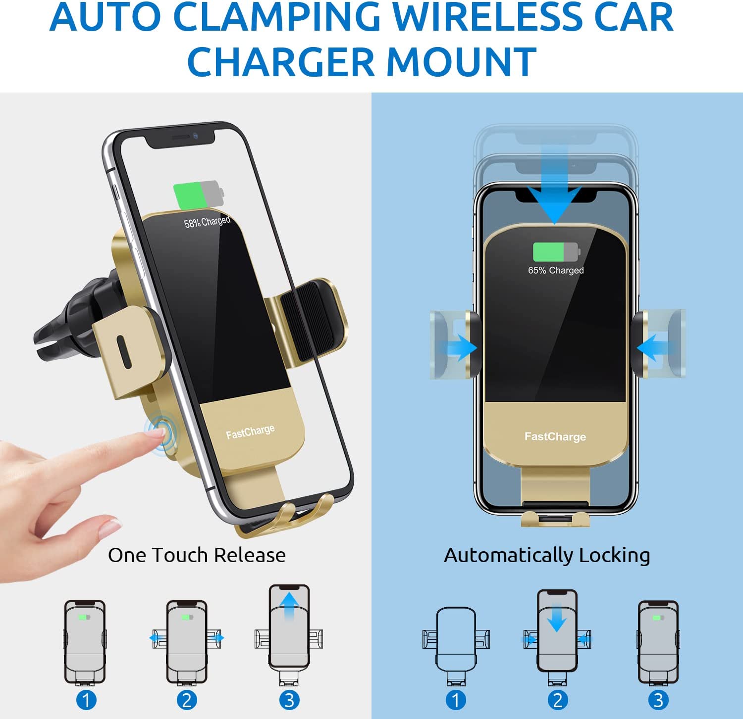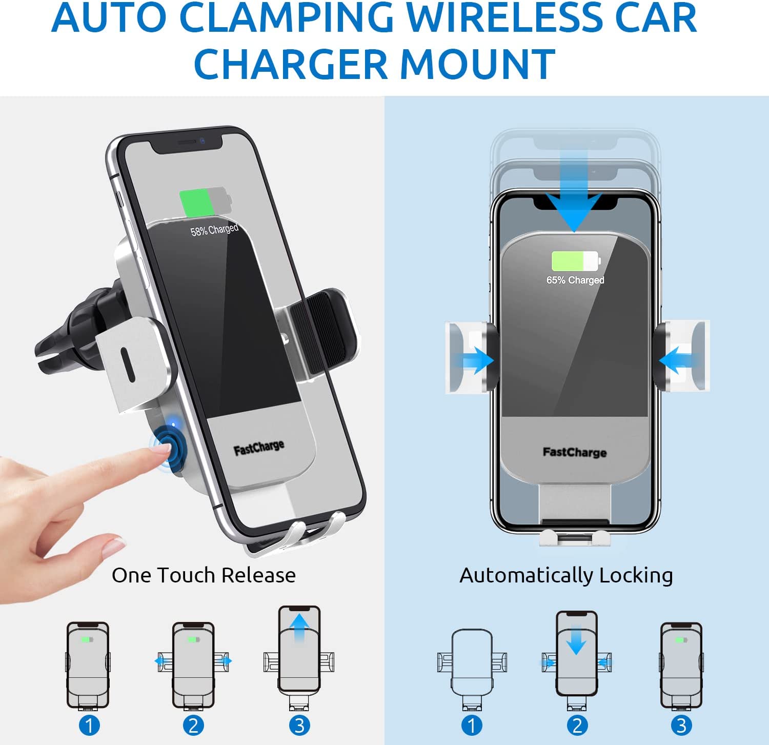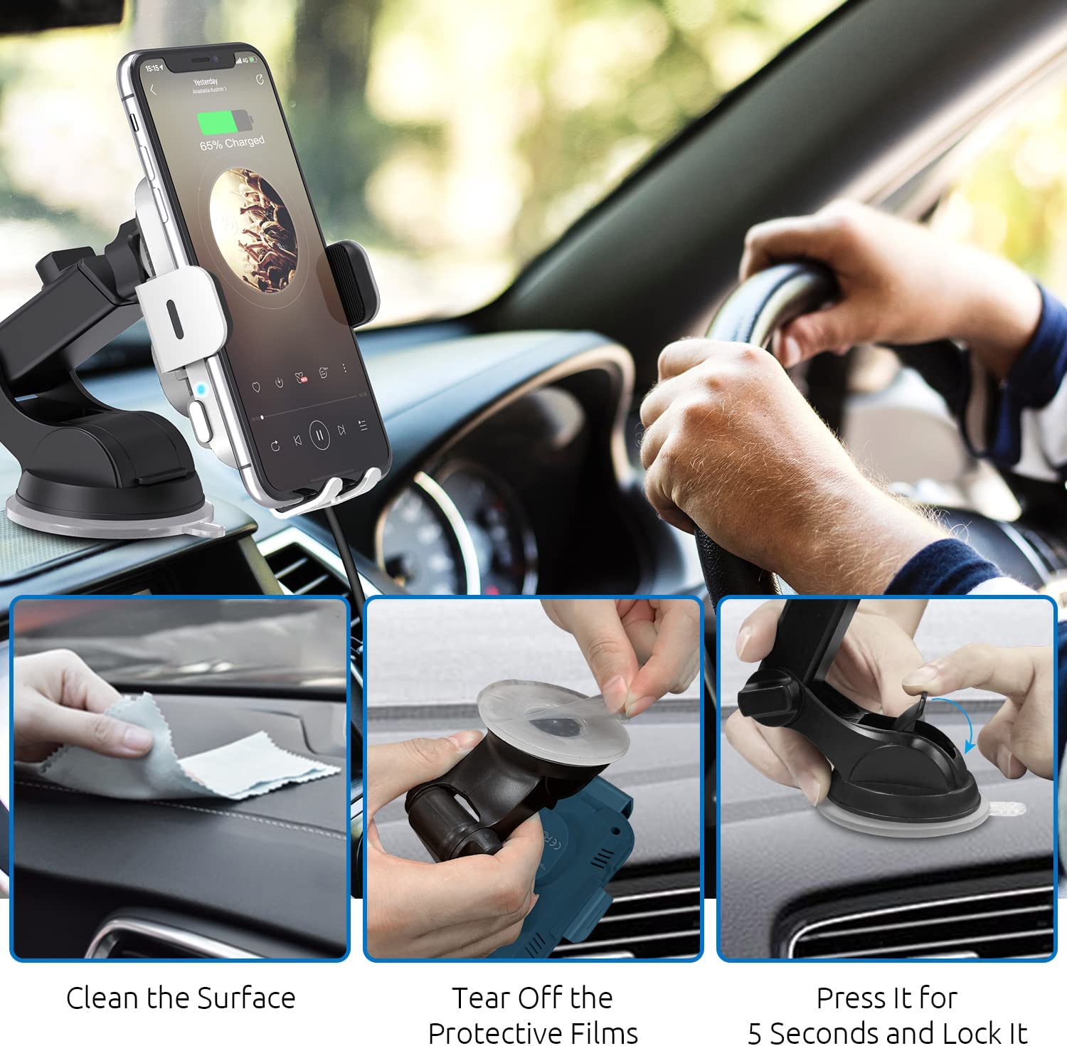 • 【INTELLIGENT IDENTIFICATION & SMART CHARGING】When connecting to the cable, the phone car mount will automatically clamp when phone is dropped in, make your driving easier and safer. A gentle touch on the 2 sides button of the charger can make the arms open. When your phone is fully charged, the wireless car phone charger will automatically power off and protect the battery of your phone