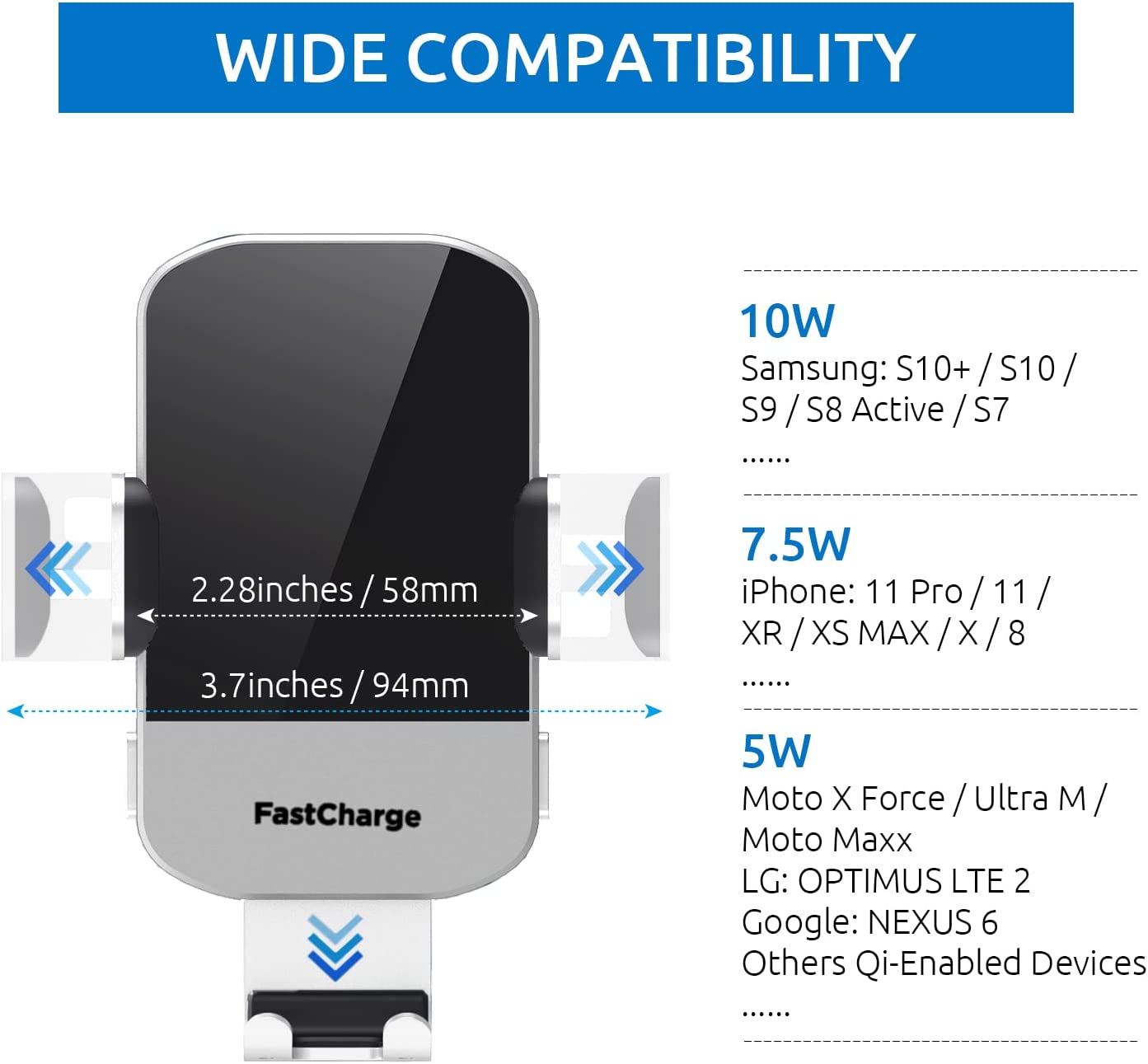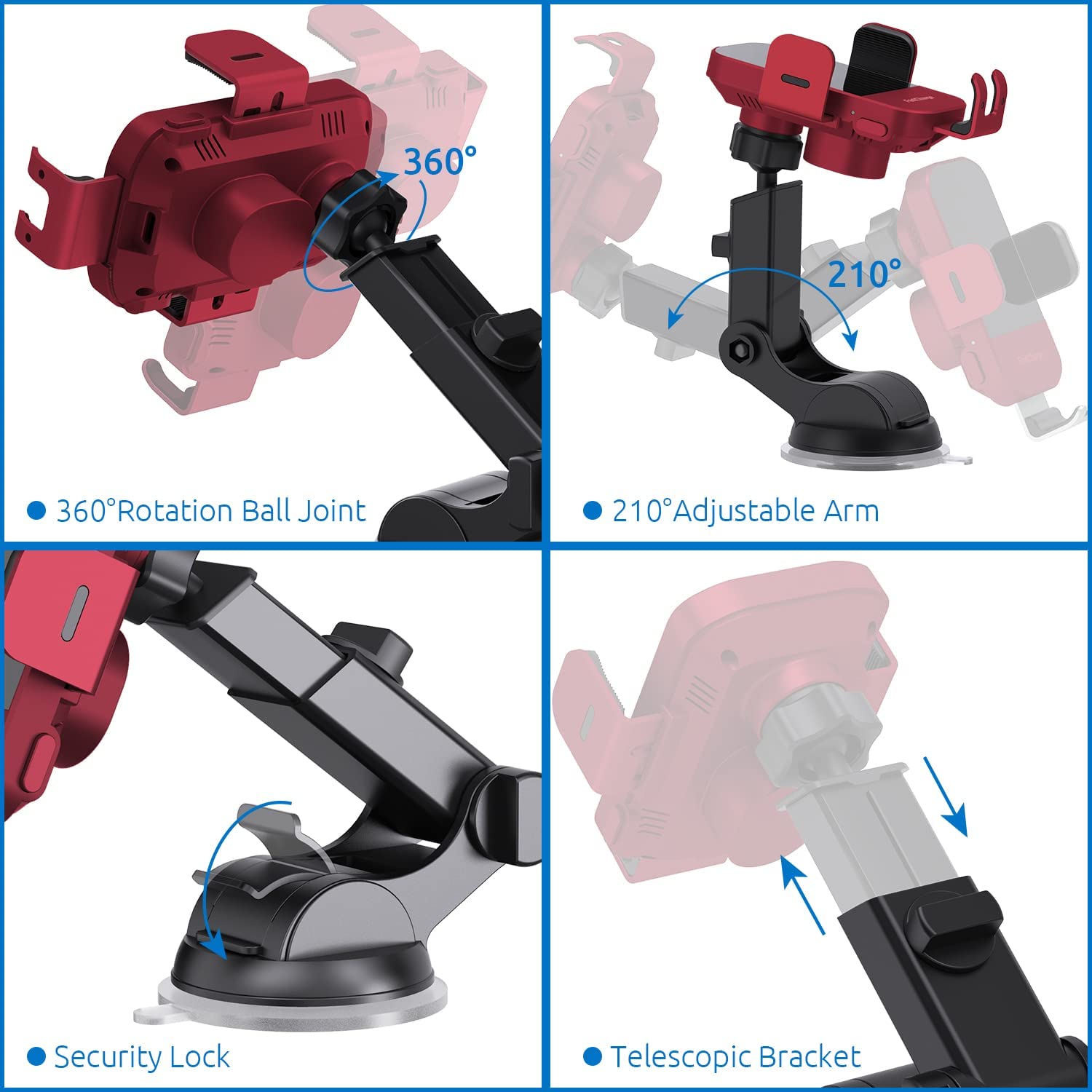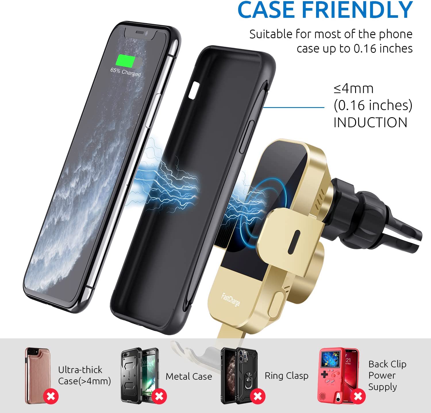 • 【INTELLIGENT IDENTIFICATION & SMART CHARGING】When connecting to the cable, the phone car mount will automatically clamp when phone is dropped in, make your driving easier and safer. A gentle touch on the 2 sides button of the charger can make the arms open. When your phone is fully charged, the wireless car phone charger will automatically power off and protect the battery of your phone