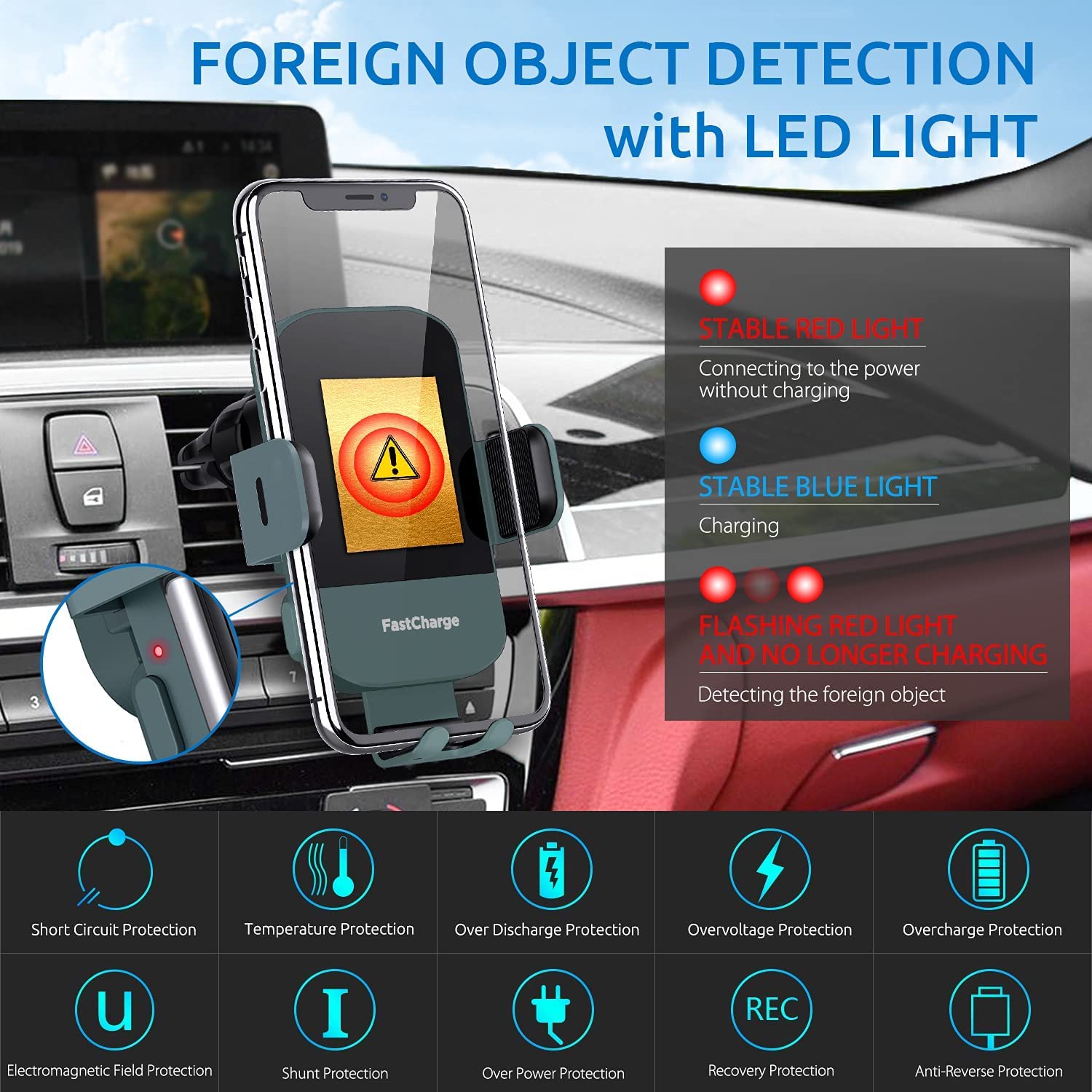 • 【FOREIGN OBJECT DETECTION with LED ALARM】When there is a metal substance between the wireless car charger mount and the phone, the car wireless charger will stop charging and the red light flashes to alarm. Effectively avoid the damage of the mobile phone caused by the high temperature of the metal Bullet Point