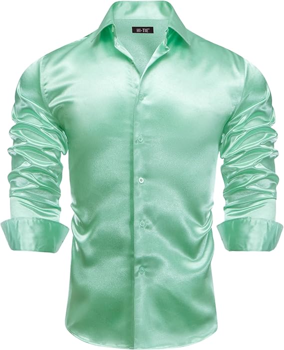 Hi-Tie Designer Silk Mint Green Solid Dress Shirt for Men Casual Party Long Sleeve Regular Fit Shirt for Daily Vacation(Large)