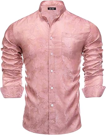 Hi-Tie Mens Band Collar Shirt Button Down Casual Long Sleeve Regular Fit Dress Shirt Prom Wedding Business