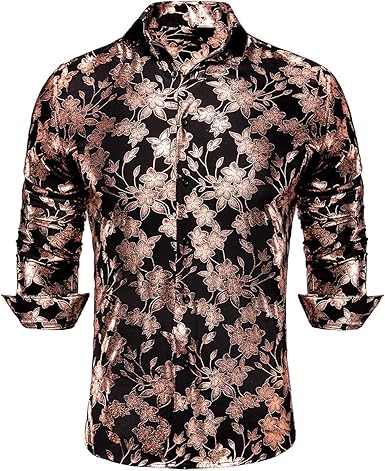 Hi-Tie Mens Black Rose Gold Dress Shirt Button Down Slim Fit Long Sleeve Nightclub Casual Shirt Party Wedding(Small)
