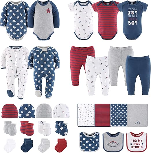 The Peanutshell Newborn Clothes & EssentIals Set, 30 Piece Baby Boy Layette Gift Set, 0-3 Month Outfits, Blue Stars