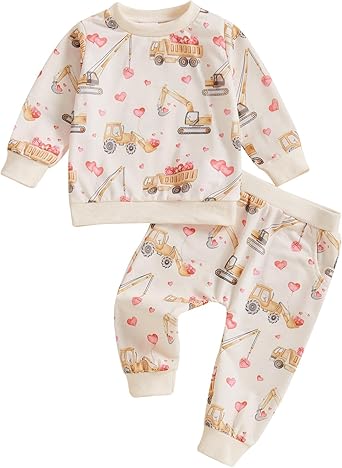 Toddler Baby Boy Valentines Day Outfits Truck Heart Print Long Sleeve Tops Sweatpants 2Pcs Spring Farm Clothes Set