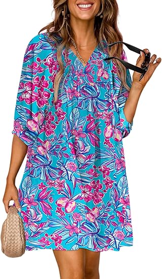 Dokotoo Womens Summer Dresses 2024 Boho Floral Drawstring V Neck Chiffon Lantern Sleeve Casual Beach Mini Dress Sundress