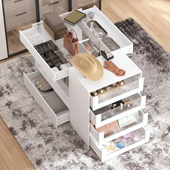 Armoire Bedroom Island Wardrobe Closet Island with 8 Drawers & Glass Tabletop, Walk in Closet Island with Drawers, Island Dresser with Display Shelf, for Bedroom White 47.2Š—�W x 23.6Š—�W x 31.5Š—�H