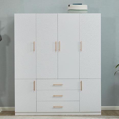 Armoire Wardrobe Closet, Wooden Wardrobe with 4 Drawers with High Storage Capacity, 74.2" 4 Door Wardrobe Closet, Tall Cabinet Closet Wardrobe with Hanging Rod White 63"L x 20.3"W x 74.2"H
