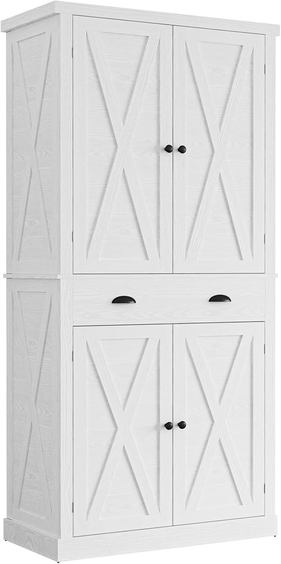 IRONCK Kitchen Pantry Storage Cabinet 72.6" H, with Barn Doors, Drawer, 4 Adjustable Shelves, Freestanding Cupboard for Dining Room Living Room, Laundry, White