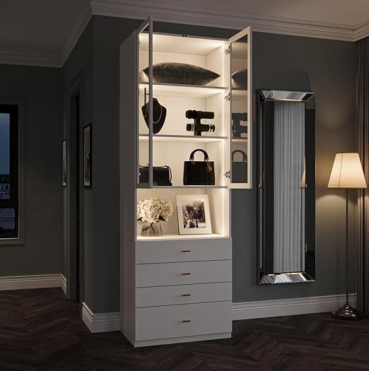 JY Furniture LED Light Armoire Wardrobe Closet with Glass Doors, Particle Wood with Drawers and Adjustable Shelves for Bedroom, Dressing Room, Kitchen, White (31.5" W x 95" H x 21" D)