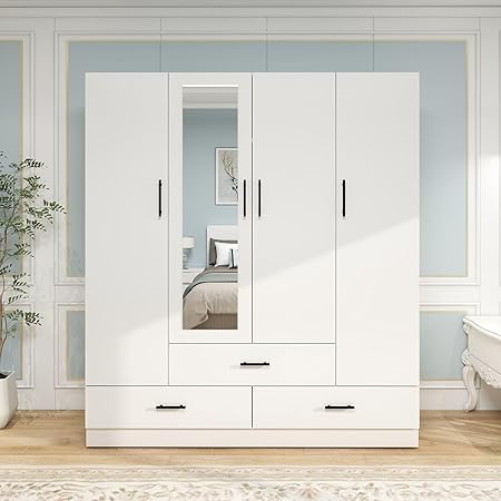 Large Wooden Armoire Wardrobe Closet Capacity Tall Cabinet with 4 Doors, 3 Drawers, 2 Hanging Rods, Mirror and Shelves for Bedroom Armoire Storage, White