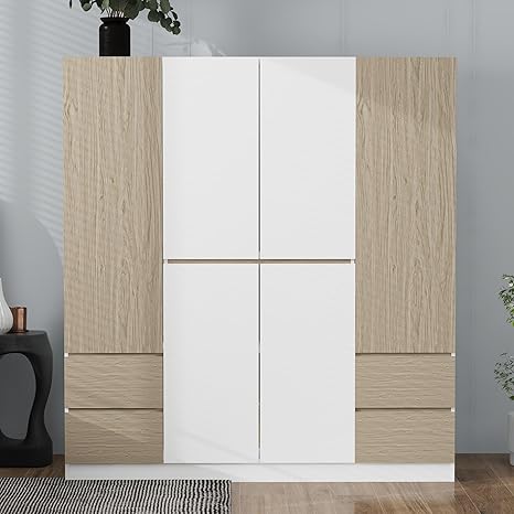 Merax 6-Doors Wooden Wardrobe Storage Shelves and Hanging Rail for Clothes for Bedroom, with 4 Drawers, White+Nature