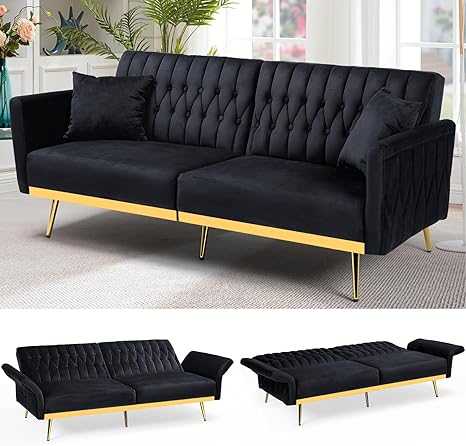 70_‹� Velvet Futon Sofa Bed with 2 Pillows and Adjustable Armrests, Convertible Sleeper Bed, Modern Loveseat for Living Room, Bedroom, Black