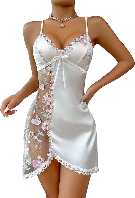 Women's Mesh Floral Embroidery Lace Trim Sheer Chemise Sleep Dresses Babydoll Nightgown Satin Slip Dress
