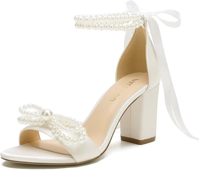 High Block Heel Wedding Sandals Pearl Heels with bow Open Toe Wedding Shoes for Bride